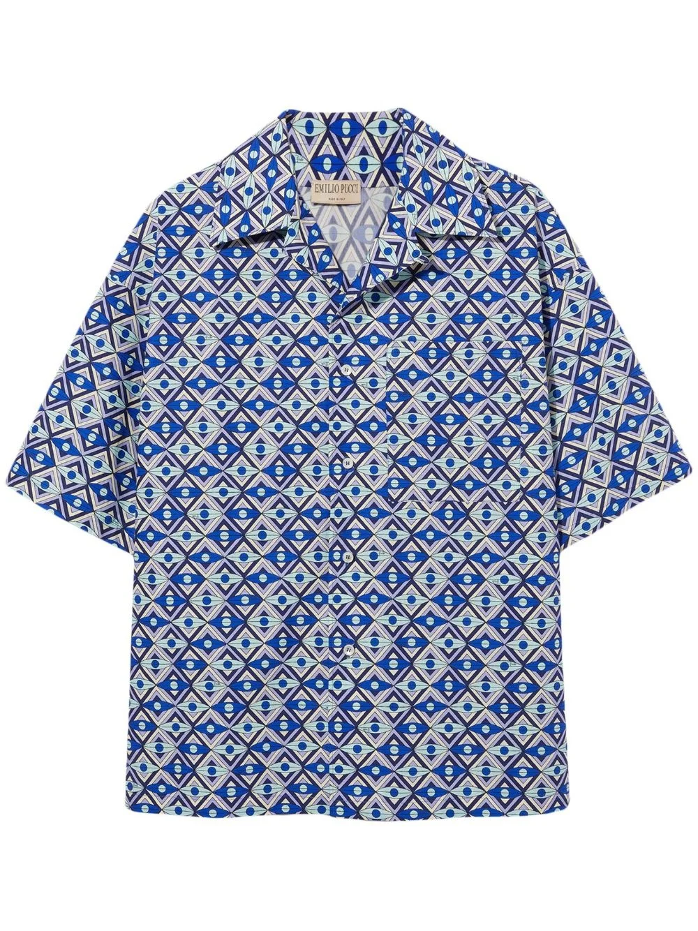 geometric-print short-sleeve shirt Highlights - Aqua blue/multicolour - Cotton - Geometric print - Camp collar - Front button fastening - Chest patch pocket - Short sleeves - Straight hem - When buying this unisex item, keep in mind that it is graded in standard men's sizing. Made in Italy Composition Cotton 100%