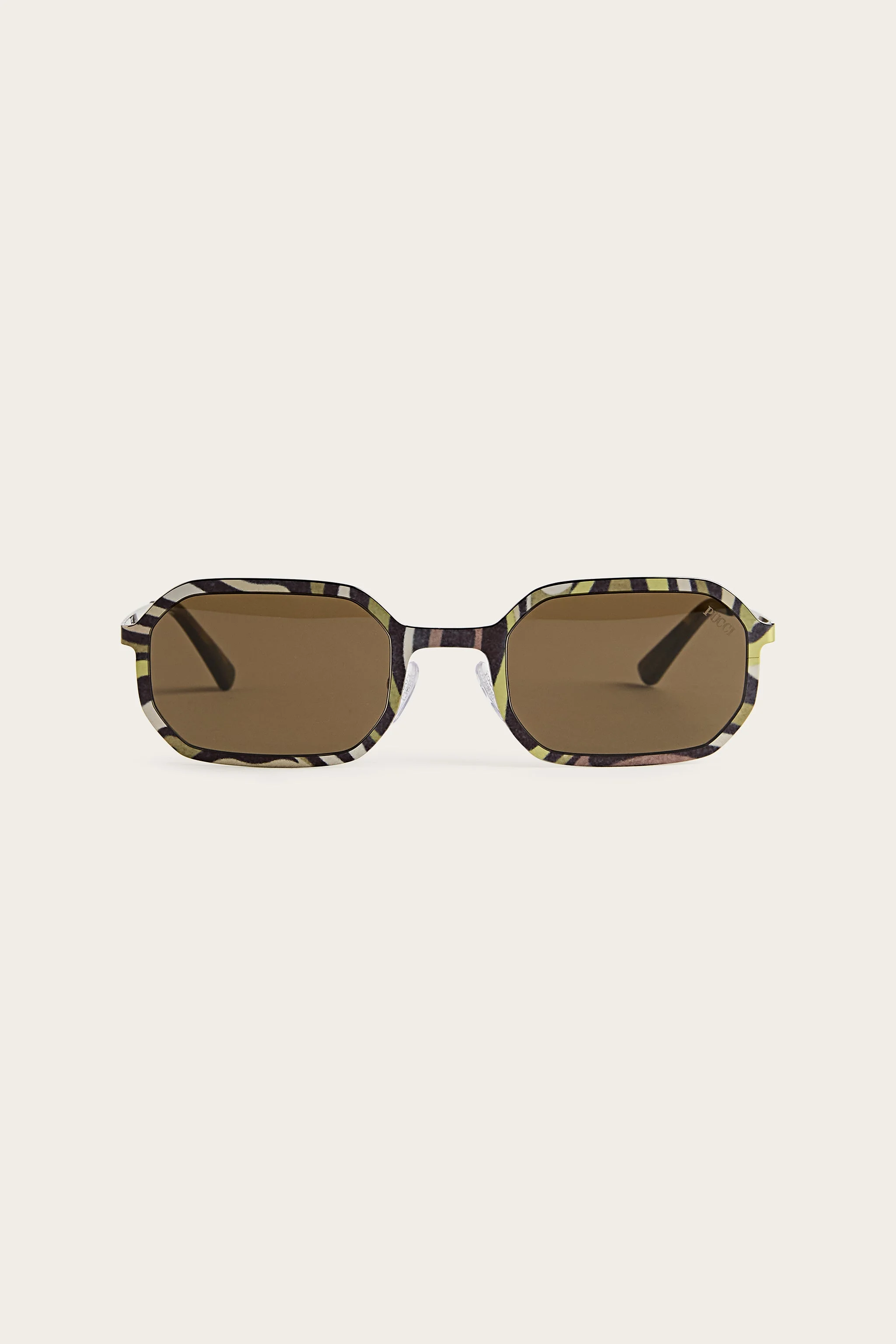 These sunglasses stand out for their geometric lens shape and lightweight metal frame, entirely decorated with a Pucci archive print. The graphic effect is modern yet sophisticated, enhanced by thin temples and acetate tips. The result is an accessory with a bold personality and unmistakable style. - Animal and Brown - Geometric printed metal frame - Size: 52 - Solid color lenses - Adjustable nose pads - Made in China - ID: EP0248M005299E