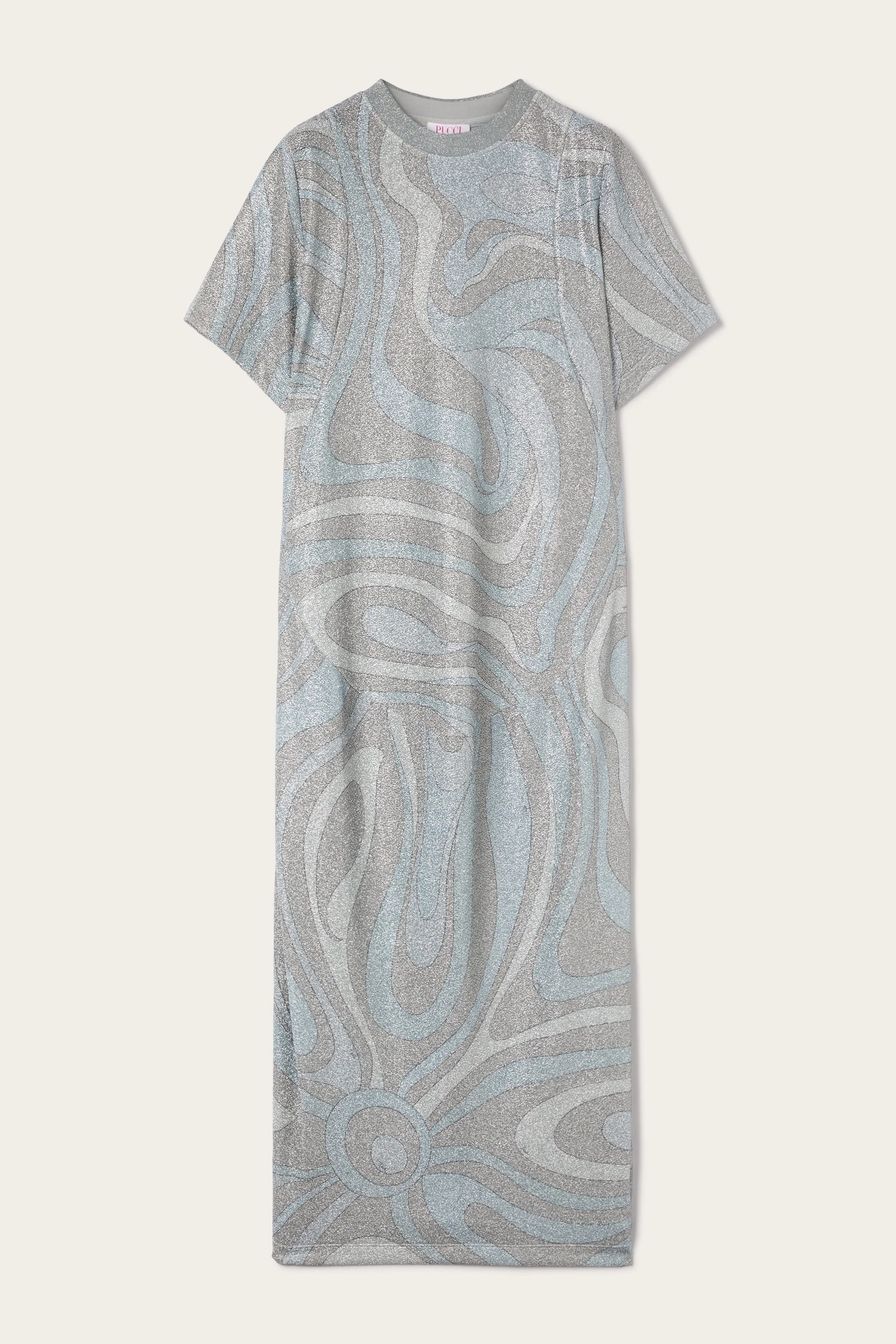 A lame jersey dress that combines flowing silhouettes and luminous finishes. The short sleeves and round neckline create a subtle, feminine balance, while the Marmo print—an iconic reinterpretation from the Pucci archives—undulates down to below the calf. The jersey is interwoven with silver metallic threads that add shine and movement to the garment, while maintaining comfort and elasticity. - To offer you a unique Pucci garment, we use an all-over print that makes the product unrepeatable. Therefore, the pattern print may vary from the one displayed in the photo. - Silver - Jersey lame with Marmo print - 75% viscose, 18% polyamide, 7% metallic fiber - Regular fit - Below-calf length - Short sleeves - Round neckline - Stretch, shiny fabric - Delicate wash at max 30°C - Made in Italy - ID: 5UJH105U767987
