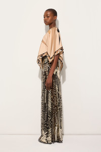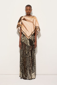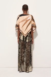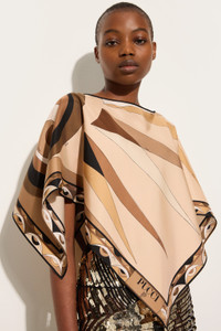 With its light, flowing silhouette, this cape blouse is a tribute to fluid, sophisticated femininity. The triangular construction rests on the shoulders with natural elegance, while the boat neckline offers a glimpse of the neckline with essential grace. The Hawaii print, with its kaleidoscopic motifs inspired by exotic, sunny landscapes, expresses the free, vacation spirit of the Pucci fashion house, blending tropical energy with refined graphic aesthetics. - To offer you a unique Pucci garment, we use an all-over print that makes the product unrepeatable. Therefore, the pattern print may vary from the one displayed in the photo. - Black and Gold - 100% silk - Cape silhouette with triangular cut - Boat neckline - Flowing, enveloping fit - Dry clean only - Made in Italy - ID: 5URM965U871P05