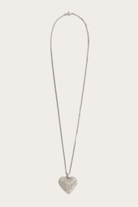 A decor piece of jewelry that combines femininity and vivacity. This brass necklace with a polished palladium finish features a large heart-shaped pendant with pendant mirror and a refined Marmo embossed texture, inspired by Pucci's iconic archival print. The long chain, decorated with a fish-shaped detail, makes the piece easy to wear and perfect for completing any look, day or evening, with originality. - Polished palladium - Material: Brass - Hear pendant with mirror and embossed Marmo texture - Long chain without clasp with fish detail - Don't wash - Made in Italy - ID: 5UAM365U920N02