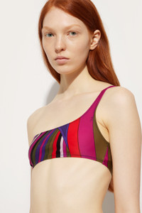 Flowing lines and archive graphics come together in this bandeau bikini top with generous coverage, embellished with a single strap on one side for an asymmetrical, contemporary touch. Made from stretch Lycra with UV protection, it is enlivened by a multicolor Iride print that adds depth and movement to the design. - To offer you a unique Pucci garment, we use an all-over print that makes the product unrepeatable. Therefore, the pattern print may vary from the one displayed in the photo. - Multicolor - Stretch Lycra - One shoulder bandeau - Hand wash - Made in Italy - ID: 5UMX295U755011