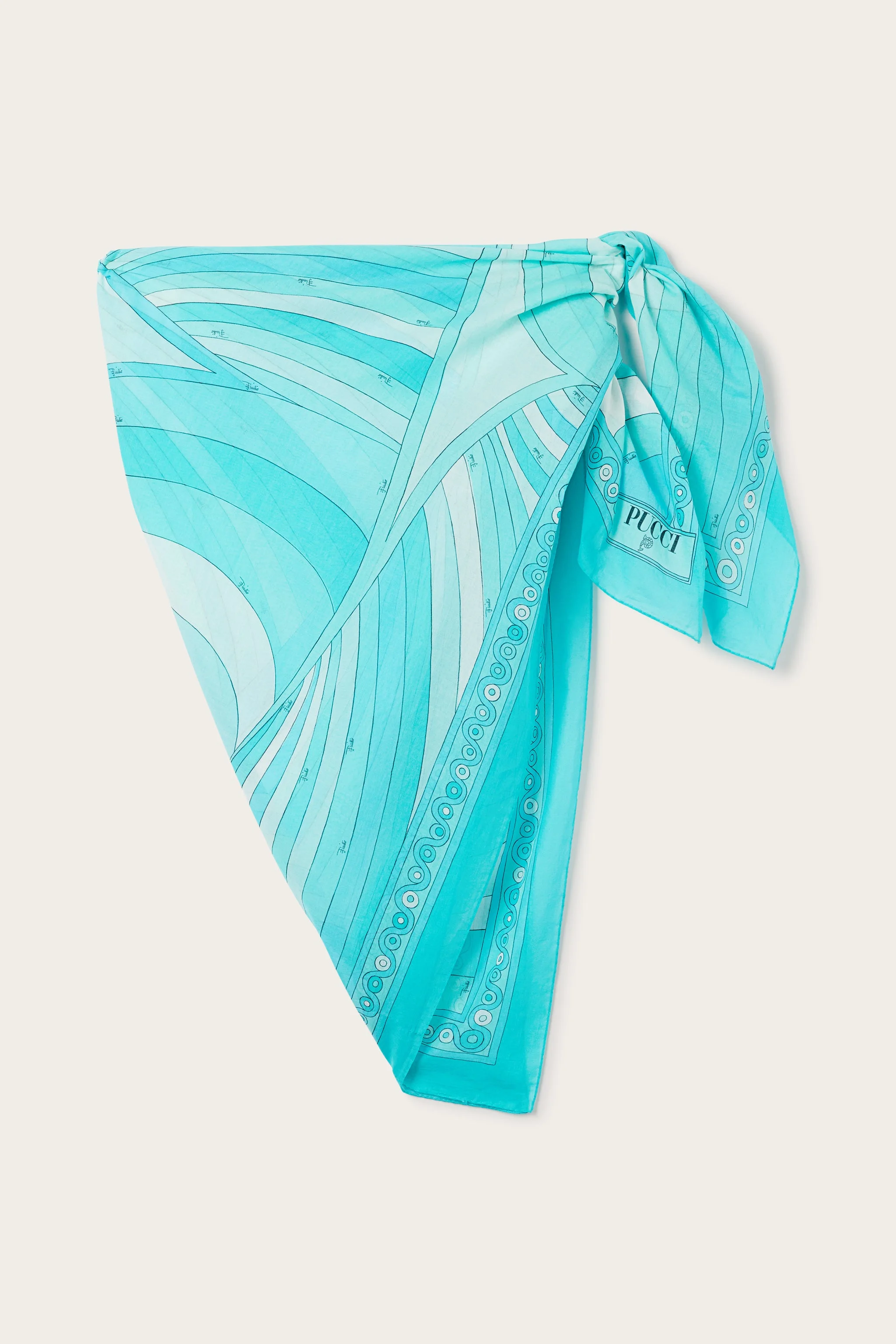 Lively, lightweight, and full of personality, this beach sarong embodies the sunny spirit of Pucci. Crafted from lightweight cotton, it drapes naturally around the body, adding a touch of elegance to every moment of the day, from the beach to cocktail hour. Its compact size and vibrant turquoise shade of the iconic Iride print make it the perfect travel companion. - To offer you a unique Pucci garment, we use an all-over print that makes the product unrepeatable. Therefore, the pattern print may vary from the one displayed in the photo. - Turquoise - 100% Cotton - Dimensions 125x140 cm - Versatile and can be worn in different ways - Wash gently at max 30°C - Made in Italy - ID: 5UPD155U975020