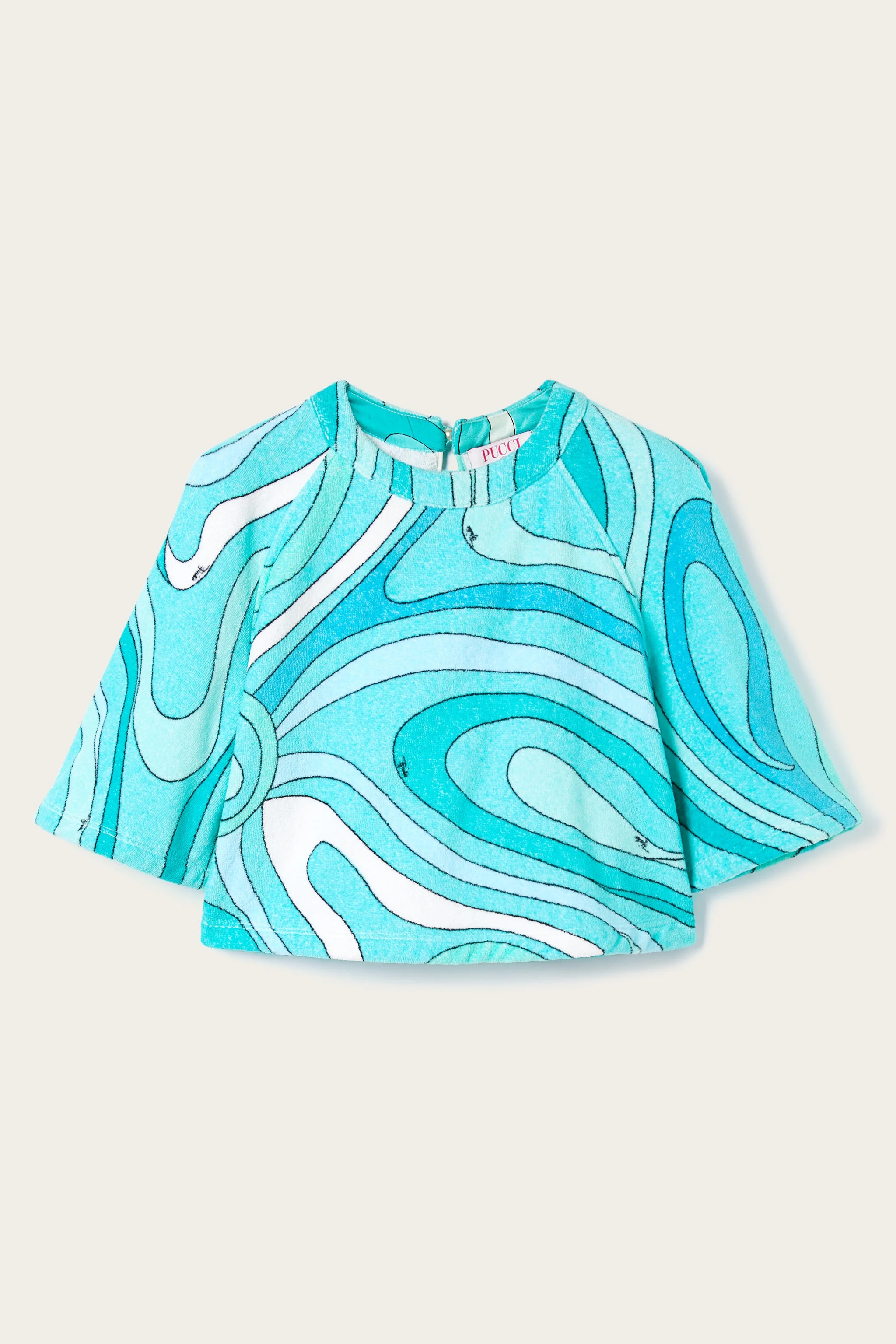 A relaxed and contemporary piece, perfect for casual yet sophisticated looks. This short, loose-fitting top is made from pure cotton terry, a soft and comfortable fabric that ensures durability and longevity. The short sleeves and round neckline enhance the simplicity of the design, while the turquoise Marmo print—an iconic 1968 archive print—wraps the surface with psychedelic lines inspired by the reflections of Capri's Blue Grotto, adding a distinctive graphic touch. - To offer you a unique Pucci garment, we use an all-over print that makes the product unrepeatable. Therefore, the pattern print may vary from the one displayed in the photo. - Turquoise - 100% cotton - Round neckline - Short sleeves - Loose and short fit - Dry clean only - Made in Italy - ID: 5URM675U869007