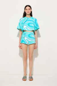 These fitted mini shorts combine a sporty cut with a sophisticated touch thanks to contrasting textures. Made from pure cotton terry, they are soft and comfortable to the touch, while remaining strong and durable. The turquoise Marmo print silk details add a graphic and vibrant accent, for a garment that balances practicality and style in perfect Pucci spirit. - To offer you a unique Pucci garment, we use an all-over print that makes the product unrepeatable. Therefore, the pattern print may vary from the one displayed in the photo. - Turquoise - Main fabric: 100% cotton - Secondary fabric: 100% silk - Slim fit - Mini length - Printed silk details - Dry clean only - Made in Italy - ID: 5URU015U869007