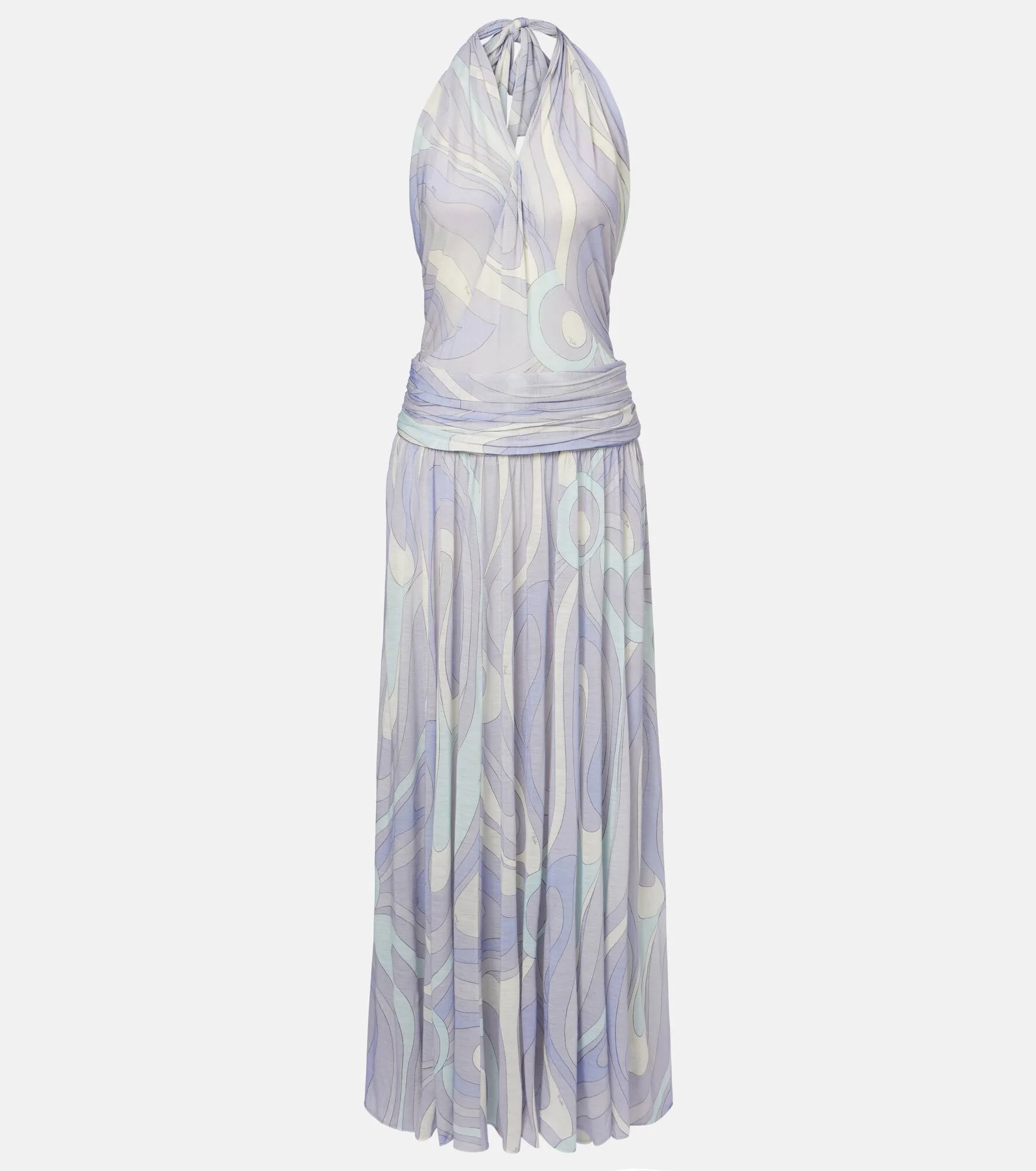 Playful and vibrant, this Pucci gown is crafted from a soft, wool-blend fabric and features a gathered maxi skirt and a halter neckline. The iconic psychedelic swirling motif is a brand signature, which earned Pucci the title "Prince of Prints". Product Details - Material: 80% wool, 20% polyamide - Care instructions: dry clean - Made in Italy - Designer color name: Lavander - Item color: multicolor - Collar: V-neck - Self-tie back - Each piece is unique and prints may differ slightly from those shown - Item number: P01110536 Size & Fit - True to size - Low back - Semi-sheer - Cinched waist - Slightly stretchy fabric - The model seen in the picture is 178cm-5'10" and wearing a size IT 40