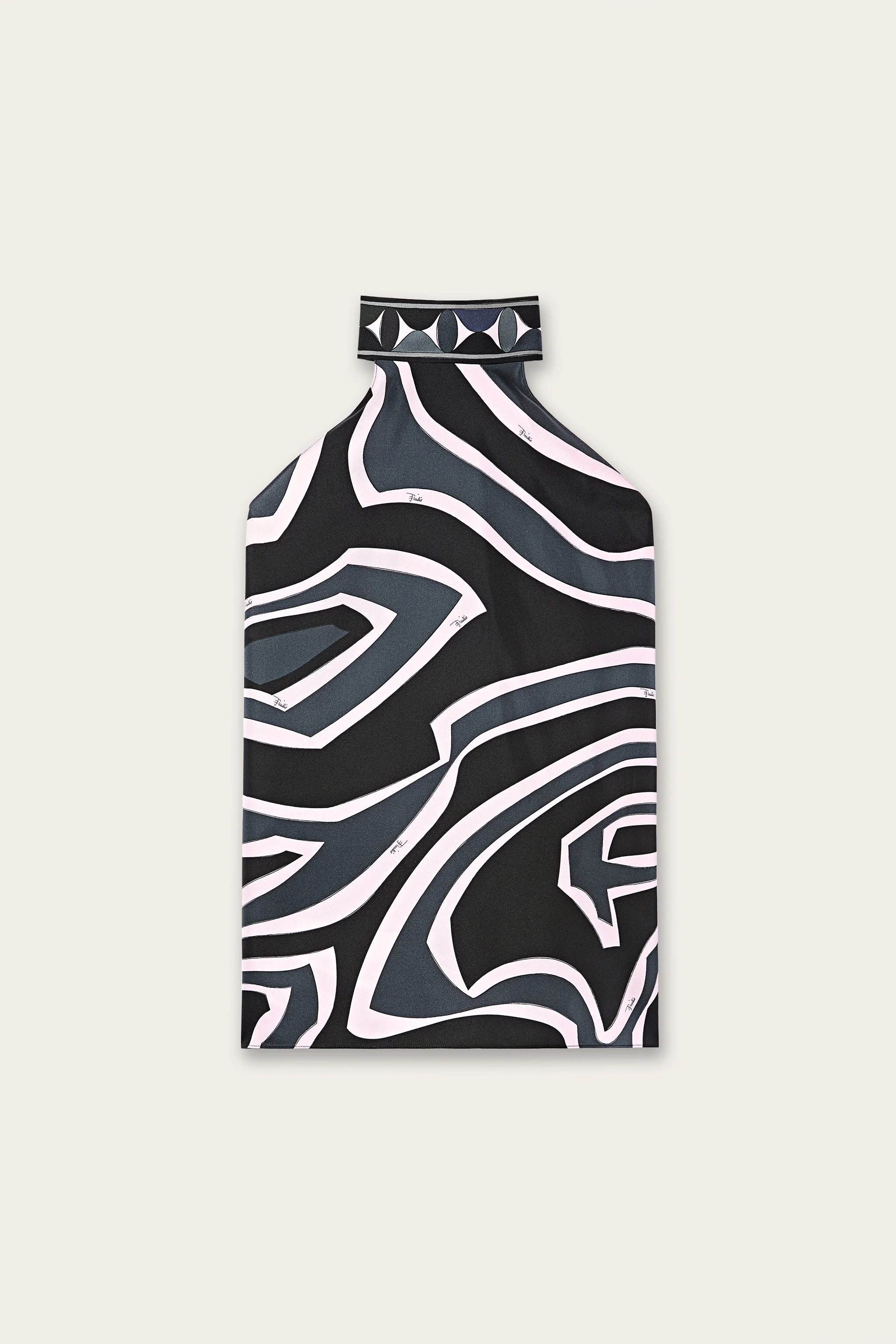 An essential and refined top that plays with light volumes and sophisticated details. Made from pure silk, this sleeveless model features a halter neckline and a tie at the back of the neck, adding a feminine and versatile touch. The Labirinto print—an archive design from 1969—plays with hypnotic geometries and visual contrasts, reinterpreting the classic labyrinth motif in an abstract and dynamic way for a bold and contemporary graphic effect. - To offer you a unique Pucci garment, we use an all-over print that makes the product unrepeatable. Therefore, the pattern print may vary from the one displayed in the photo. - Black and Pink - 100% silk - Sleeveless - Halter neck with adjustable tie - Flowing fit - Dry clean only - Made in Italy - ID: 5URM435U741047