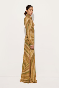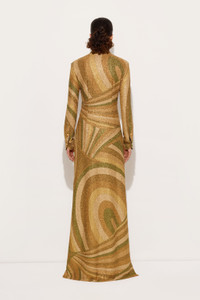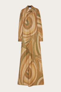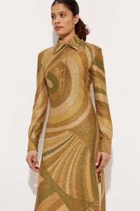 Sleek lines and bright details define this fitted dress, designed to elegantly enhance the figure. The pointed collar and button closure at the front evoke retro elegance, while the Iride print unfolds in dynamic waves and concentric arcs that add energy and movement to the look. The lame jersey, interwoven with golden metallic threads, creates a shiny, vibrant effect, perfect for special occasions. - To offer you a unique Pucci garment, we use an all-over print that makes the product unrepeatable. Therefore, the pattern print may vary from the one displayed in the photo. - Gold - Jersey lame with interwoven metallic threads - 73% viscose, 17% metallic fiber, 10% polyamide - Pointed collar - Long sleeves - Slim fit - Decorative buttons - Dry clean only - Made in Italy - ID: 5UJI655U867993