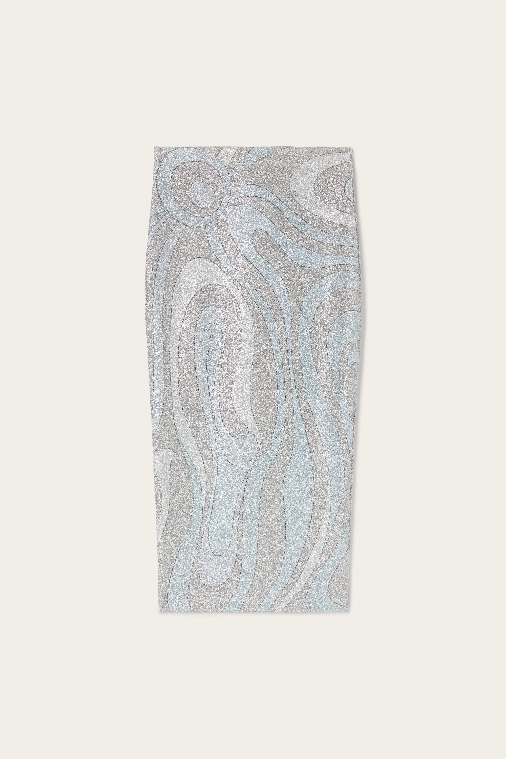 A sparkling character and sculpted silhouette come together in this fitted midi skirt. The lame jersey, interwoven with silver metallic yarns, elegantly reflects the light, while the Marmo print—an iconic 1968 motif inspired by Capri's Blue Grotto—envelops the body with its psychedelic waves. An eye-catching piece designed to shine. - To offer you a unique Pucci garment, we use an all-over print that makes the product unrepeatable. Therefore, the pattern print may vary from the one displayed in the photo. - Silver - Jersey lame with interwoven metallic threads - 75% viscose, 15% polyester, 10% metallic fiber - Marmo all-over print - Fitted silhouette - Midi length - Natural stretch for a comfortable fit - Delicate dry clean - Made in Italy - ID: 5UJV125U767987