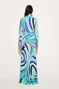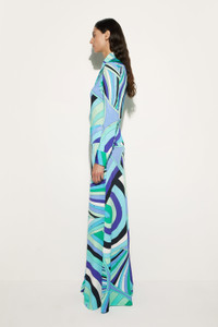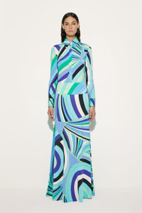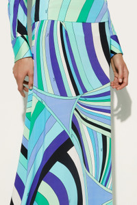 Essential elegance and fluid movement meet in this long skirt, featuring a straight cut that slims the silhouette. The ribbed waist adds definition to the shape while offering comfort and support. Made of jersey with lycra yarns, this skirt is a reinterpretation of Pucci's iconic fabric, designed to enhance the shine and softness of the garment. The Iride print in shades of green and lilac gives a refined and dynamic touch, making it perfect for those who love the brand's distinctive style. - To offer you a unique Pucci garment, we use an all-over print that makes the product unrepeatable. Therefore, the pattern print may vary from the one displayed in the photo. - Green and lilac - Straight cut - Ribbed waist - Main fabric: 95% Viscose, 5% Elastane - Gently dry clean. - Made in Italy - ID: 5HJW105H757009 - Model is 177 cm tall and wears Italian size 38.
