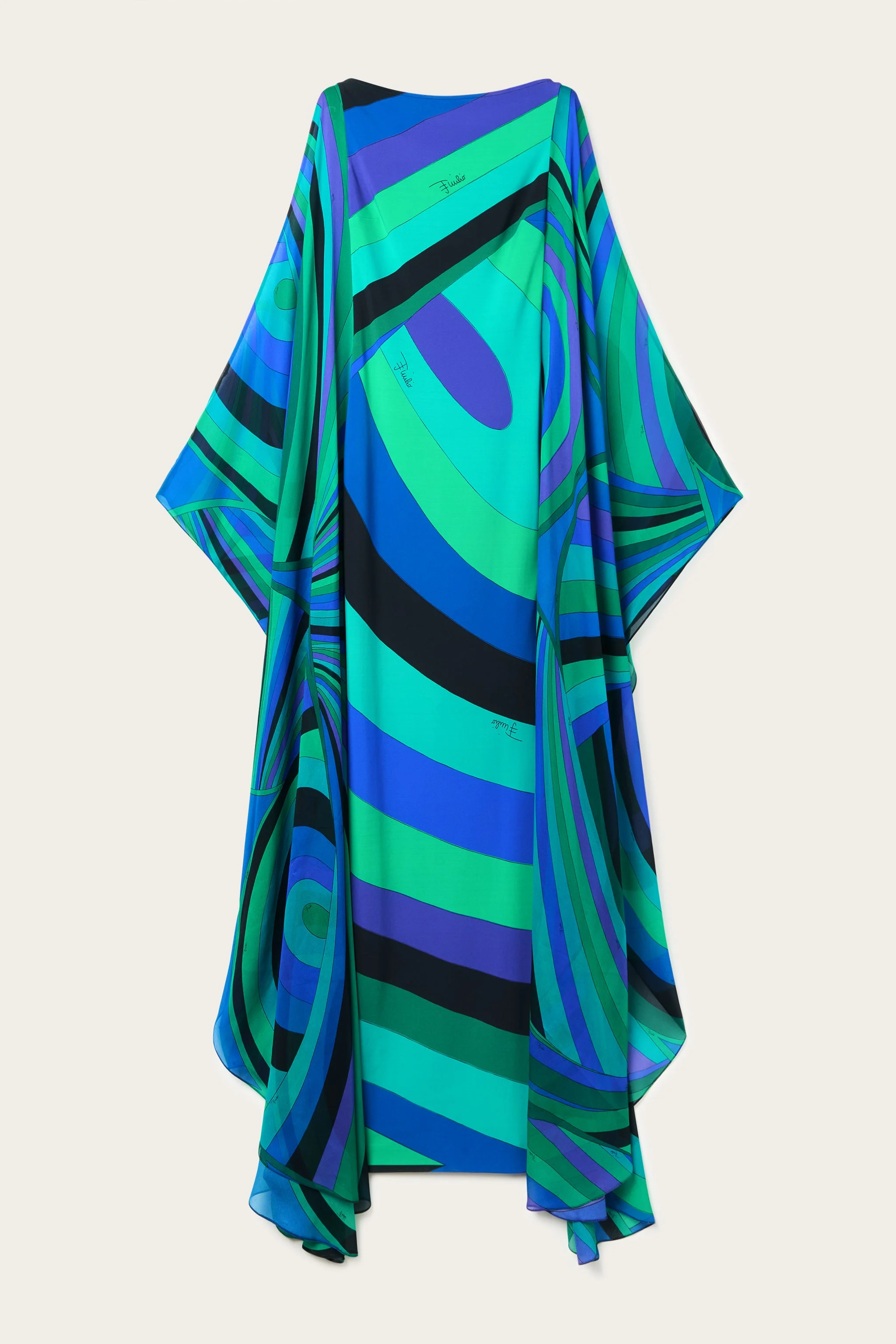 A dress that celebrates movement and femininity with extraordinary grace. The long, fitted silhouette, embellished with wide cape sleeves, wraps the body in a jersey that sculpts and enhances the shape with elegance.The enlarged version of the Iride print makes each garment a unique work of art. The emerald hue adds depth and mystery to the design, evoking the beauty of nature and the dynamism of the fashion house. Wear it for special evenings or to feel flawless on an important occasion-this dress can only make you the queen of the party. - To offer you a unique Pucci garment, we use an all-over print that makes the product unrepeatable. Therefore, the pattern print may vary from the one displayed in the photo. - Emerald - Viscose jersey - Long, wide cape sleeves - Macro Iride print - ID: 5HJI905H859051 - The model is 175 cm tall and wears a 38 italian size.