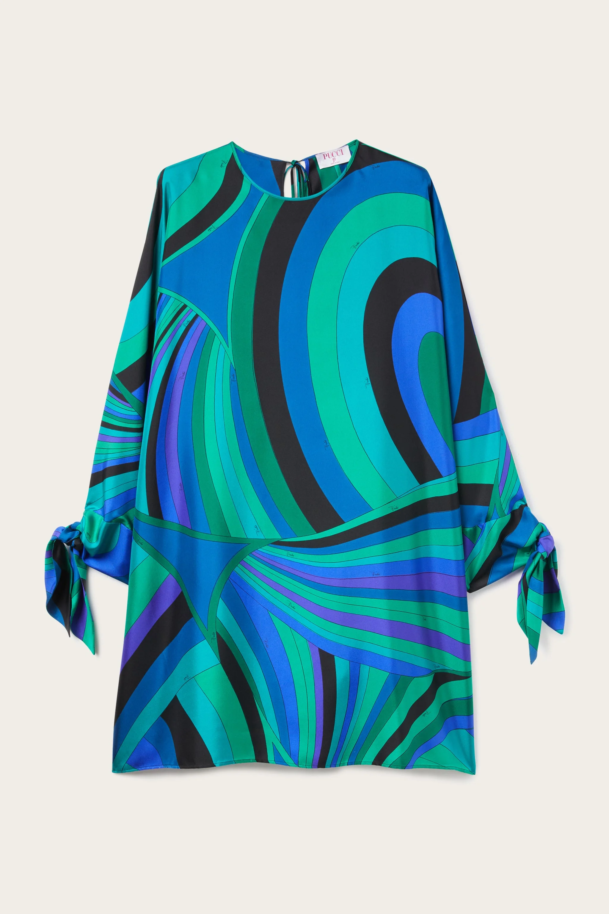 A garment with an ethereal silhouette that embodies the relaxed elegance typical of the Pucci style. This fluid caftan features a round neckline and long cape sleeves, creating a delicate play of volume and movement. Ties at the cuffs add a refined touch, allowing the fit to be adjusted gracefully and lightly.The emerald-colored Iride print gives the fabric a dynamic and sophisticated effect, making this kaftan perfect for relaxed moments and special occasions in comfort and style. - To offer you a unique Pucci garment, we use an all-over print that makes the product unrepeatable. Therefore, the pattern print may vary from the one displayed in the photo. - Emerald - 100% silk - Long sleeves with cape - Round neck - Laces at cuffs - Fluid and lightweight fabric - Gently dry clean. - Made in Italy. - ID: 5HRL725H751010 - The model is 176 cm tall and wears Italian size 38.