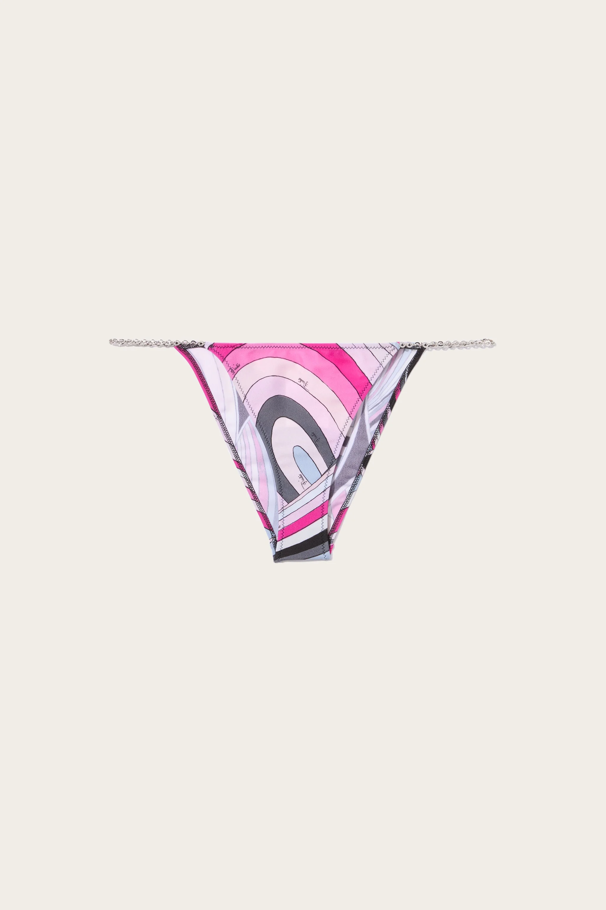 A mix of femininity and iconic details, these bikini bottoms reinterpret beach style with a sophisticated twist. The minimalist design is enhanced by metal chain ties at the sides, adding brightness and a precious accent to the look.Made of stretch Lycra with anti-UV treatment, they offer a comfortable fit and protection from the sun's rays. The Iride print in shades of black and fuchsia expresses all the energy and dynamism of the Pucci aesthetic, perfect for those who like to stand out even at the beach. - To offer you a unique Pucci garment, we use an all-over print that makes the product unrepeatable. Therefore, the pattern print may vary from the one displayed in the photo. - Black and fuchsia - Stretchy Lycra with anti-UV treatment - Main fabric: 80% Polyamide, 20% Elastane - Hand wash. - Made in Italy - ID: 5HMX655H855058 - Model is 178 cm tall and wears XS
