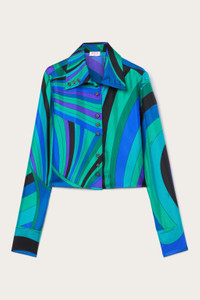 A perfect balance between sophistication and modernity. This long-sleeved cropped shirt, made of silk twill, is distinguished by its light yet defined structure, which enhances the natural sheen of the fabric. The classic collar and front buttons add a touch of timeless elegance, while the short cut lends a fresh, contemporary air. The emerald Iride print illuminates the design with its dynamic color scheme, enhancing the graphic and distinctive appeal of the Pucci world. - To offer you a unique Pucci garment, we use an all-over print that makes the product unrepeatable. Therefore, the pattern print may vary from the one displayed in the photo. - Emerald - 100% Silk - Cropped cut - Classic collar and front buttons - Regular shoulders - Long sleeves - Gently dry clean - Made in Italy - ID: 5HRJ155H751010 - Model is 177 cm tall and wears Italian size 38.