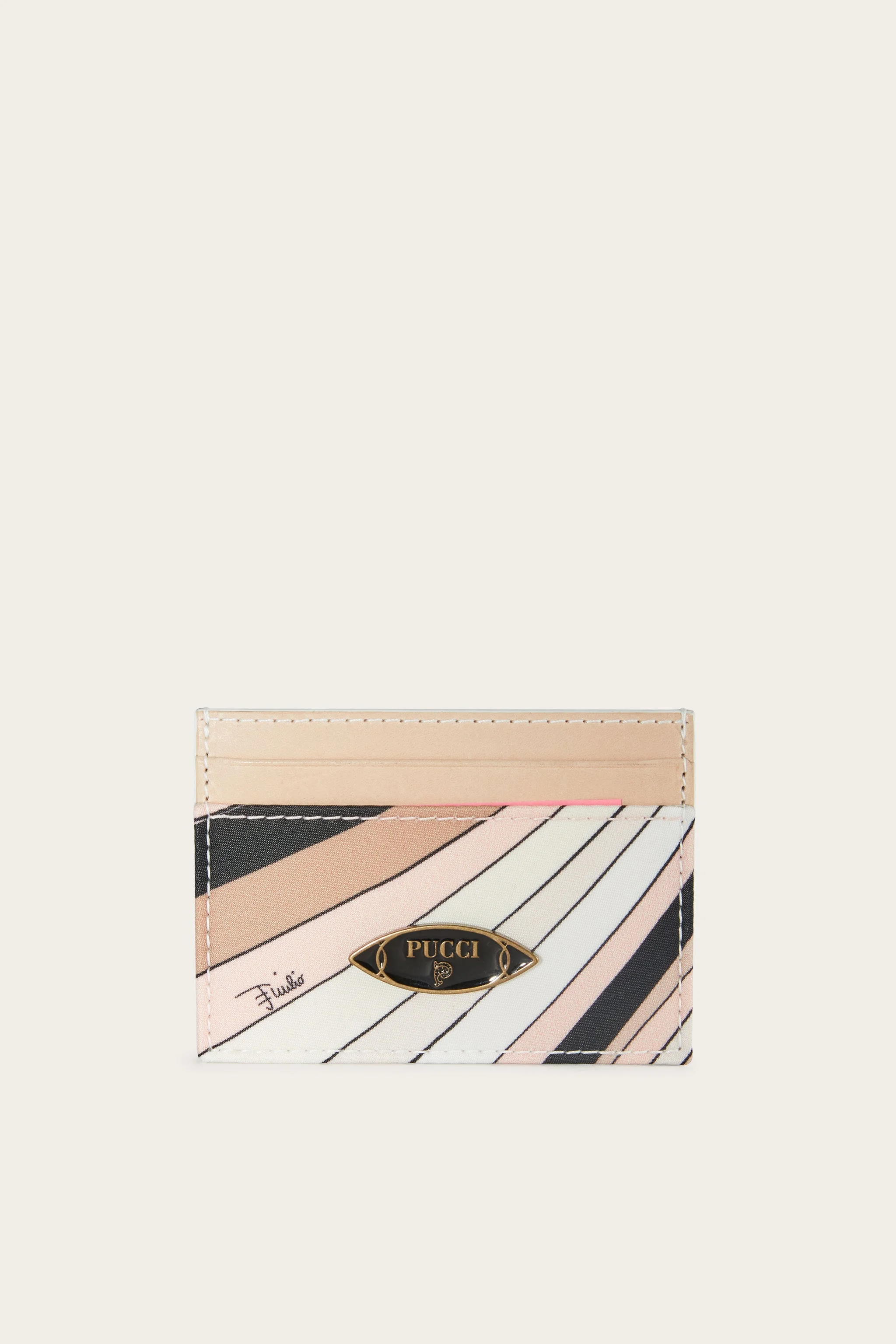 A compact, refined accessory perfect for storing your cards in style. This printed nylon card case is embellished with nappa leather trim and a Pucci enamel plaque, which adds a distinctive touch.Contrasting edges enhance the sophisticated design, while the nude-colored Iride print gives a timelessly elegant graphic effect. A small essential with a strong character, ideal for those who love thoughtful and functional details. - To offer you a unique Pucci garment, we use an all-over print that makes the product unrepeatable. Therefore, the pattern print may vary from the one displayed in the photo. - Nude - Outer: 100% Polyamide - Finish: Nappa leather - Lining: Nappa leather - Pucci enameled leather - Contrasting edges - Not to be washed. - Made in Italy. - ID: 5HSG155H152007