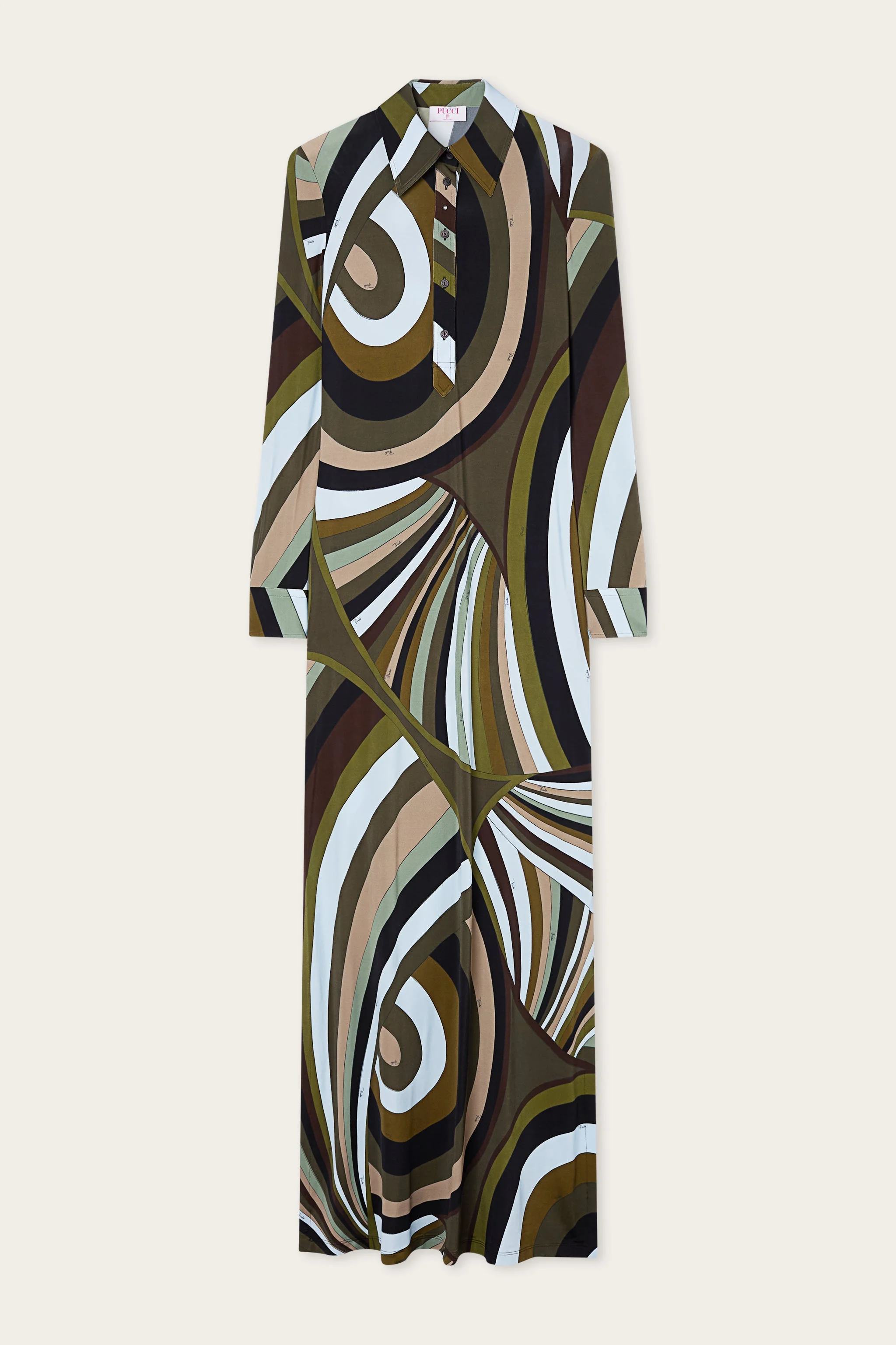 A dress with a bold character that interprets the Iride print with elegance and precision enhanced by the combination of khaki and blue colors. The fitted silhouette is defined by a pointed collar that frames the decollete with a clean line, while the long sleeves accompany the movement with balance. Button details add a decorative and structured accent, enhancing the design with a subtle rhythm. - To offer you a unique Pucci garment, we use an all-over print that makes the product unrepeatable. Therefore, the pattern print may vary from the one displayed in the photo. - Khaki and Blue - 95% viscose 5% elastane - Pointed collar - Long sleeves - Button details - Slim fit - Dry clean only - Made in Italy - ID: 6HJI666H757008