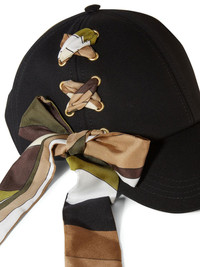 Iride-print cotton cap Pucci's black cap is crafted from cotton in Italy. It's made unique with its silk scarf woven through eyelets and printed with the label's signature Iride print in multicoloured hues. Highlights - Black - Multicolour - Cotton - Silk - Abstract pattern print - Scarf detailing - Eyelet detailing - Curved peak - Fabric-covered button at the crown - Adjustable strap to the rear - Gold-tone hardware Made in Italy Composition Cotton 100%, Silk 100% Washing instructions Dry Clean Only