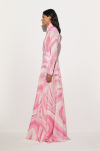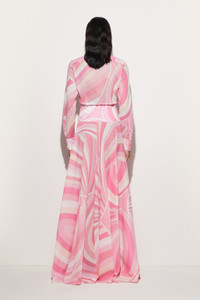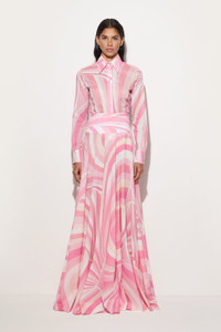 A refined garment that glides naturally along the silhouette, enhancing every step with lightness. This toe-length skirt, with its straight cut and delicate hemline movement, is made of lightweight, draped cotton with a soft texture that makes it pleasant to wear at any time of day. The Iride print in delicate shades of pink, adds a graphic and contemporary touch. - To offer you a unique Pucci garment, we use an all-over print that makes the product unrepeatable. Therefore, the pattern print may vary from the one displayed in the photo. - Pink - 100% Cotton - Lightweight drapey fabric - Straight cut with movement at the hem - Iride print - Gently wash max 30°C. - Made in Italy - ID: 5HRW325H754040 - The model is 176 cm tall and wears a 38 italian size.