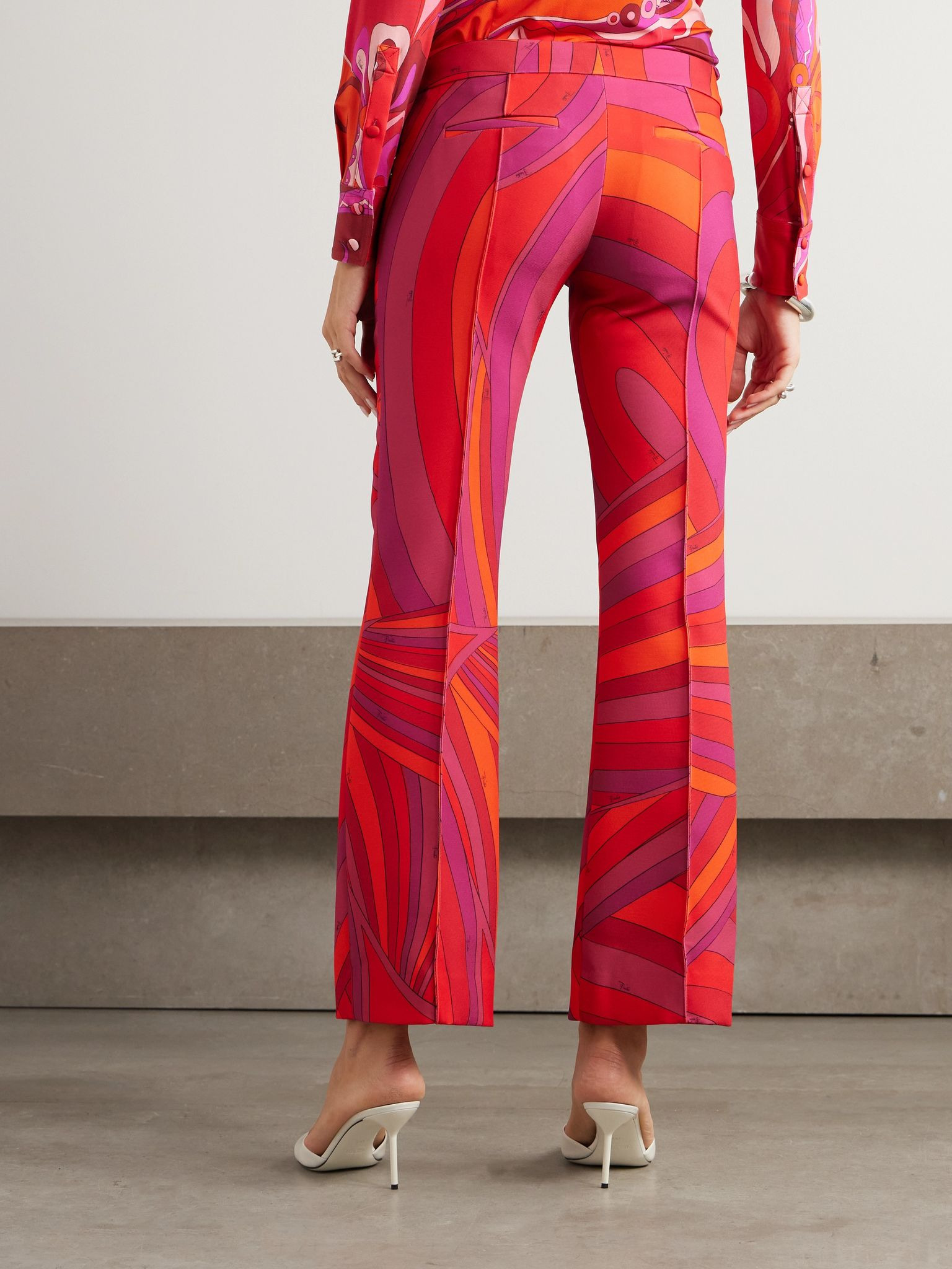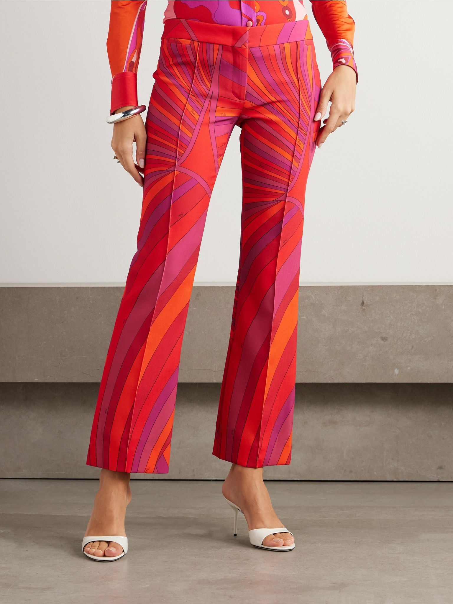 Taking inspiration from the swinging '60s, PUCCI's pants are printed with its signature 'Iride' motif in playful rays of color. They've been tailored in Italy from cady to sit on your natural waist and fall to straight legs that land just above the ankle. Style yours with mules or flat sandals. Size & Fit - Fits true to size, take your normal size - Mid-rise, designed for a straight-leg fit - Mid-weight, slightly stretchy fabric - Model is 175cm/ 5'9" and is wearing an IT 40 Model measurements: - Bust: 78cm/ 31" - Waist: 62cm/ 24.5" - Hip: 92cm/ 36" Details & Care - Red, tonal-purple and black cady - Concealed hook, button and zip fastening at front - 96% polyester, 4% elastane - Dry clean