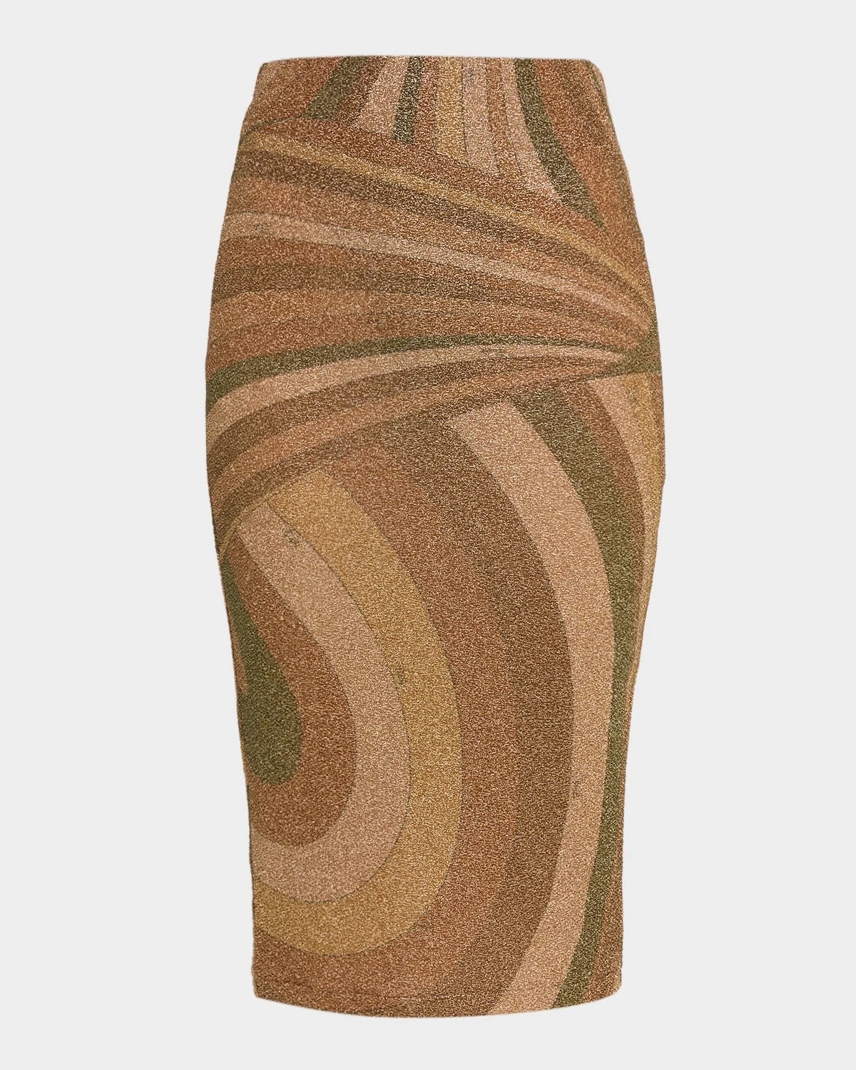 Crafted from shimmering lame jersey, this midi skirt by Pucci is adorned with a Iride print for a bold silhouette. High rise Elastic waistband Bodycon silhouette Hem hits around the knee Pullon style Nylon/polyamide/polyester/elastane Dry clean only Made in Italy