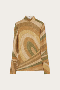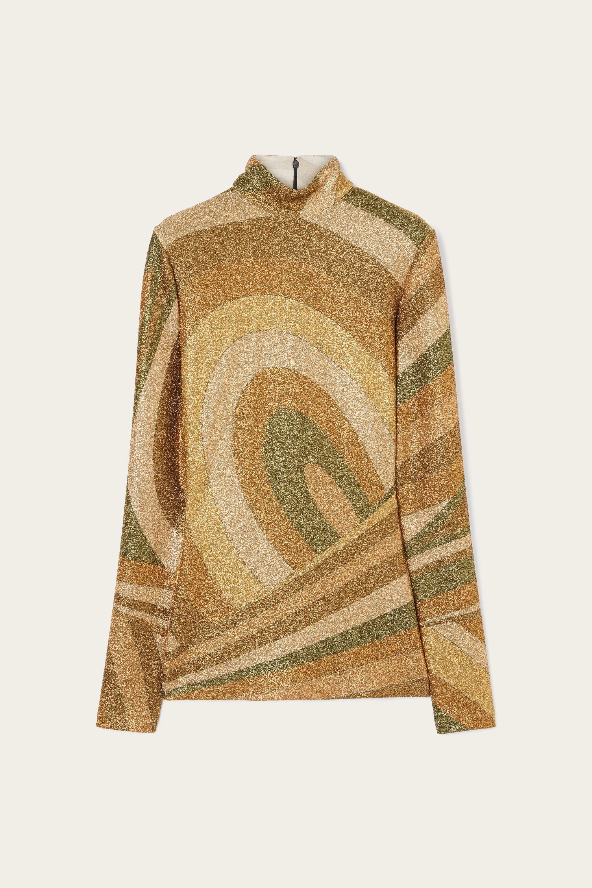A luminous and sophisticated garment that wraps around the body like a second skin. This high-neck sweater is crafted in jersey woven with golden metallic threads, creating a unique shiny effect, perfect for day-to-night looks. The weave ensures elasticity and comfort, while the gold Iride print adds an iconic touch that reflects Pucci's archival spirit. - Gold - Main fabric: 65% polyamide – 30% polyester – 5% elastane - High neck - Long fitted sleeves - Snug and stretchy fit - Delicate dry clean - Made in Italy - ID: 5UJM105U867993