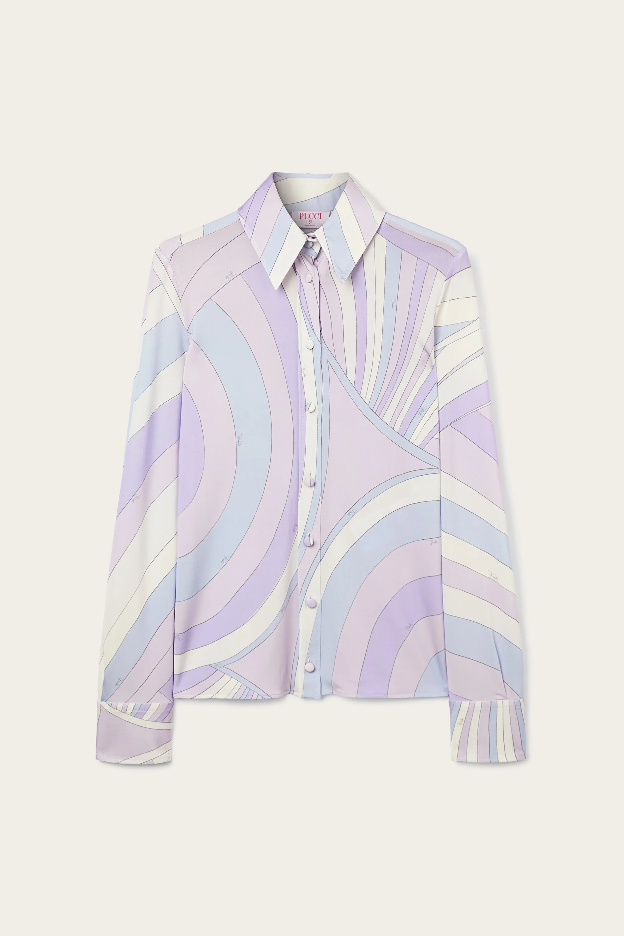 A sophisticated shirt with a tapered silhouette that combines sartorial elegance with contemporary comfort. Crafted in satin jersey with twisted Lycra yarns, it stands out for its luminous, fluid surface. The fitted cut flatters the figure, while the classic collar and button closure evoke the style of traditional shirts. The lavender Iride print, an iconic motif from the Pucci archives, adds a distinctive and vibrant touch of color to the garment. - To offer you a unique Pucci garment, we use an all-over print that makes the product unrepeatable. Therefore, the pattern print may vary from the one displayed in the photo. - Lavender - Twisted Lycra satin jersey - 87% viscose, 13% elastane - Classic collar - Long sleeves - Front button closure - Slim fit - Delicate dry clean - Made in Italy - ID: 5UJJ055U757009