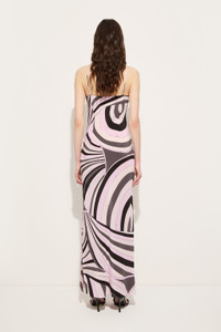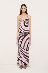 This sleeveless long dress is a perfect balance between elegance and lightness. Featuring a deep V-neckline and thin straps that add a feminine and refined touch, the design is completed by a side slit that enhances the movement of the silhouette. Made from silk crepe de chine, it is further embellished by the Iride print in black and pink, which adds a graphic and vibrant touch inspired by the liveliness of the 1970s. - To offer you a unique Pucci garment, we use an all-over print that makes the product unrepeatable. Therefore, the pattern print may vary from the one displayed in the photo. - Black and Pink - Silk crepe de chine - V-neckline - Thin straps - Side slit on the leg - Lightweight, flowing fabric - Dry clean only - Made in Italy - ID: 5URI265U753010