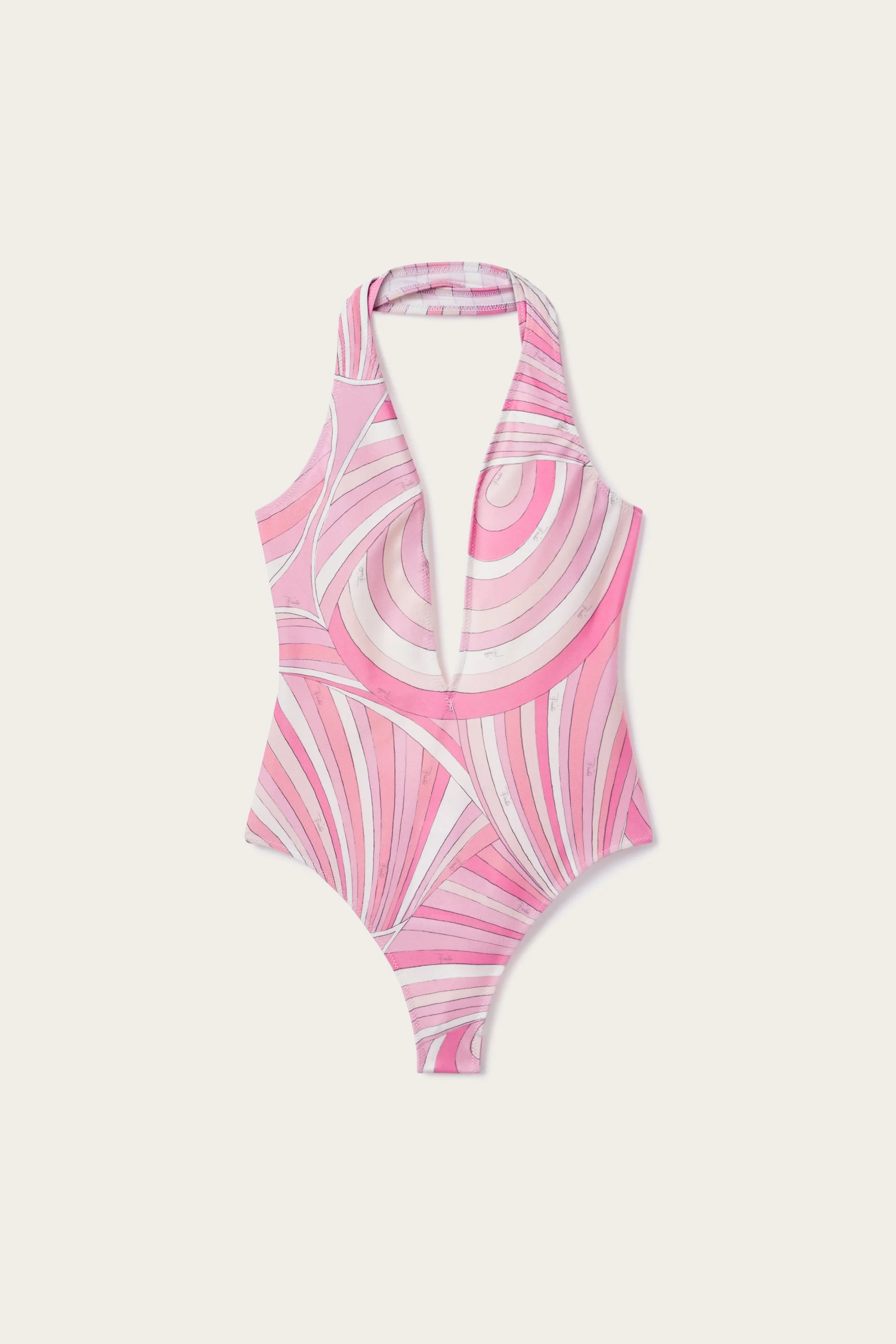 Elegance and comfort meet in this one-piece swimsuit with a sophisticated design. The deep V-neckline enhances femininity with sophistication, while the thick straps ensure optimal support and a comfortable fit. Made of stretch lycra with anti-UV treatment, it is perfect to accompany you on sunny days, ensuring freedom of movement and protection from the sun's rays. The Iride print in shades of pink gives a vibrant and harmonious touch, evoking the delicacy and energy of nature. - To offer you a unique Pucci garment, we use an all-over print that makes the product unrepeatable. Therefore, the pattern print may vary from the one displayed in the photo. - Pink - Stretchy Lycra with anti-UV treatment - Whole swimsuit with deep V-neckline - Thick straps for added support - Main fabric: 80% Polyamide, 20% Elastane - Hand wash. - Made in Italy - ID: 5HMC155H855057 - Model is 176 cm tall and wears Italian size 38.