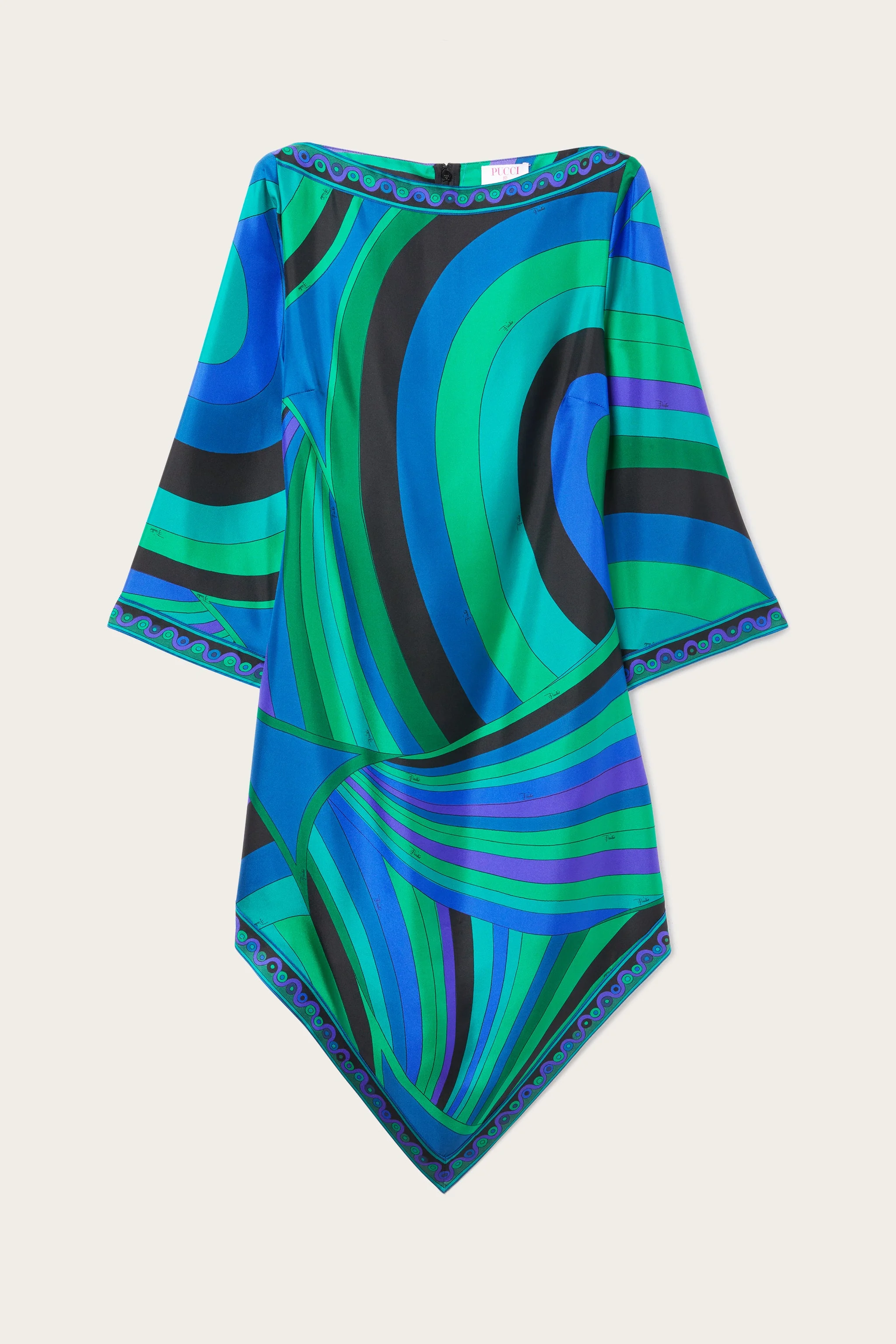 Lightweight, sophisticated and with unmistakable graphic appeal. This mini dress combines essential lines and fluid details, with a straight silhouette enhanced by wide elbow-length sleeves and an asymmetric hemline that lends movement and dynamism. Made of 100% silk, it hugs the body with extreme lightness, while the emerald Iride print adds depth and character. Perfect for those who love versatile and impactful garments that combine elegance and modernity. - To offer you a unique Pucci garment, we use an all-over print that makes the product unrepeatable. Therefore, the pattern print may vary from the one displayed in the photo. - Emerald - 100% silk - High neck mini dress - Straight cut - Large elbow-length sleeves - Asymmetrical hemline - Gently dry clean. - Made in Italy - ID: 5HRG015H751010 - Model is 178 cm tall and wears Italian size 38.