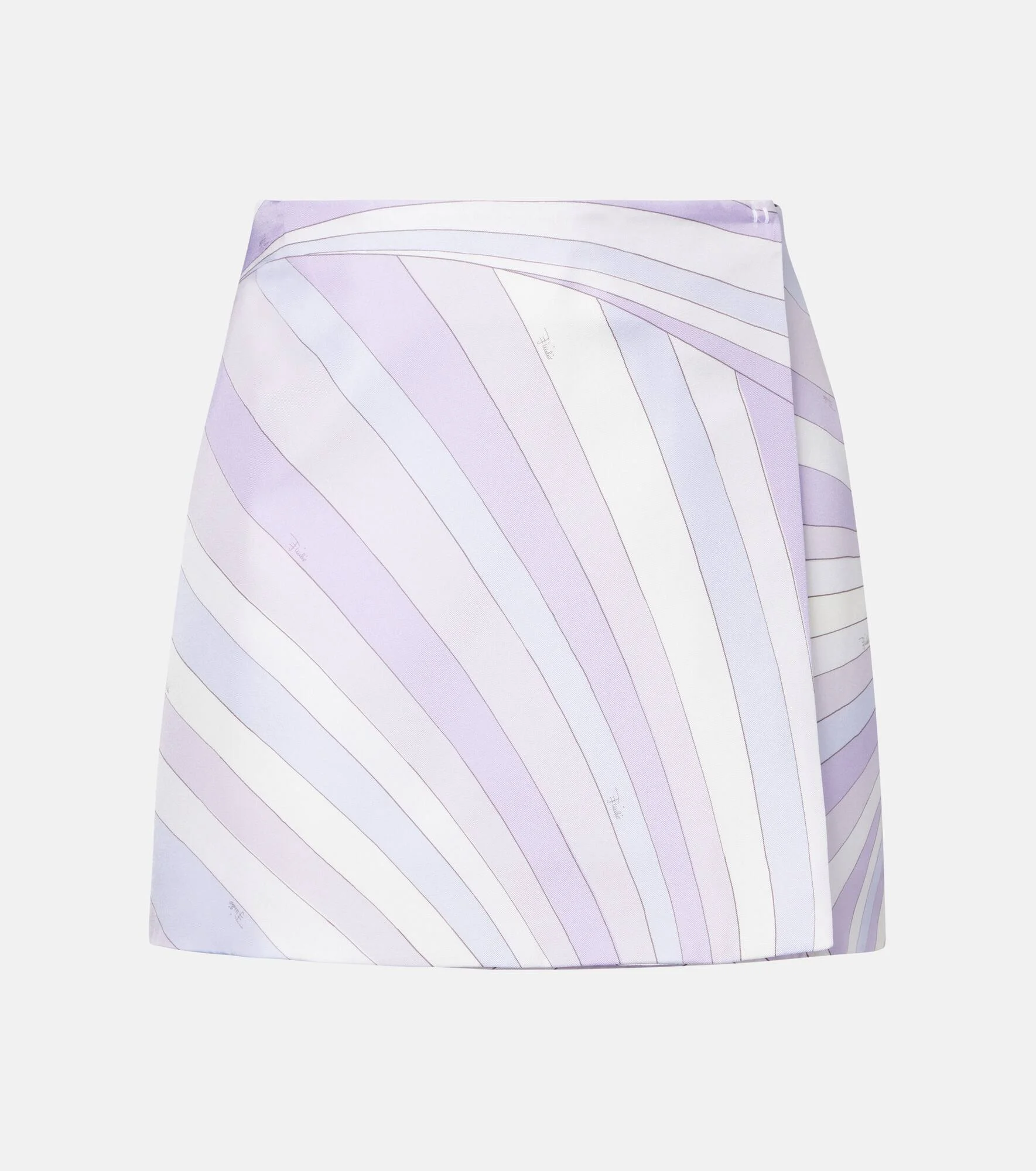 Playful and vibrant, this Pucci miniskirt is crafted from lustrous silk satin and features a classic wrap silhouette. The iconic psychedelic swirling motif is a brand signature, which earned Pucci the title "Prince of Prints". Product Details - Material: 100% silk - Care instructions: dry clean - Made in Italy - Designer color name: Lavender - Item color: purple, multicolor - Lining: 67% acetate, 33% polyester - Closure: wrap-front, snap-buttoned front - Each piece is unique and prints may differ slightly from those shown - Item number: P01110739 Size & Fit - True to size - Non-stretchy fabric - The model seen in the picture is 178cm-5'10" and wearing a size IT 40