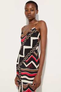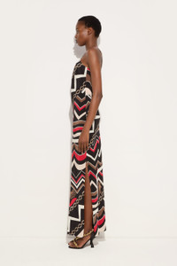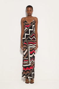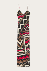 This sleeveless long dress is a perfect balance between elegance and lightness. Featuring a deep V-neckline and thin straps that add a feminine and refined touch, the design is completed by a side slit that enhances the movement of the silhouette. - To offer you a unique Pucci garment, we use an all-over print that makes the product unrepeatable. Therefore, the pattern print may vary from the one displayed in the photo. - Gold and Red - 100% Silk - V-neckline - Thin straps - Side slit on the leg - Lightweight, flowing fabric - Dry clean only - Made in Italy - ID: 5URI255U723057