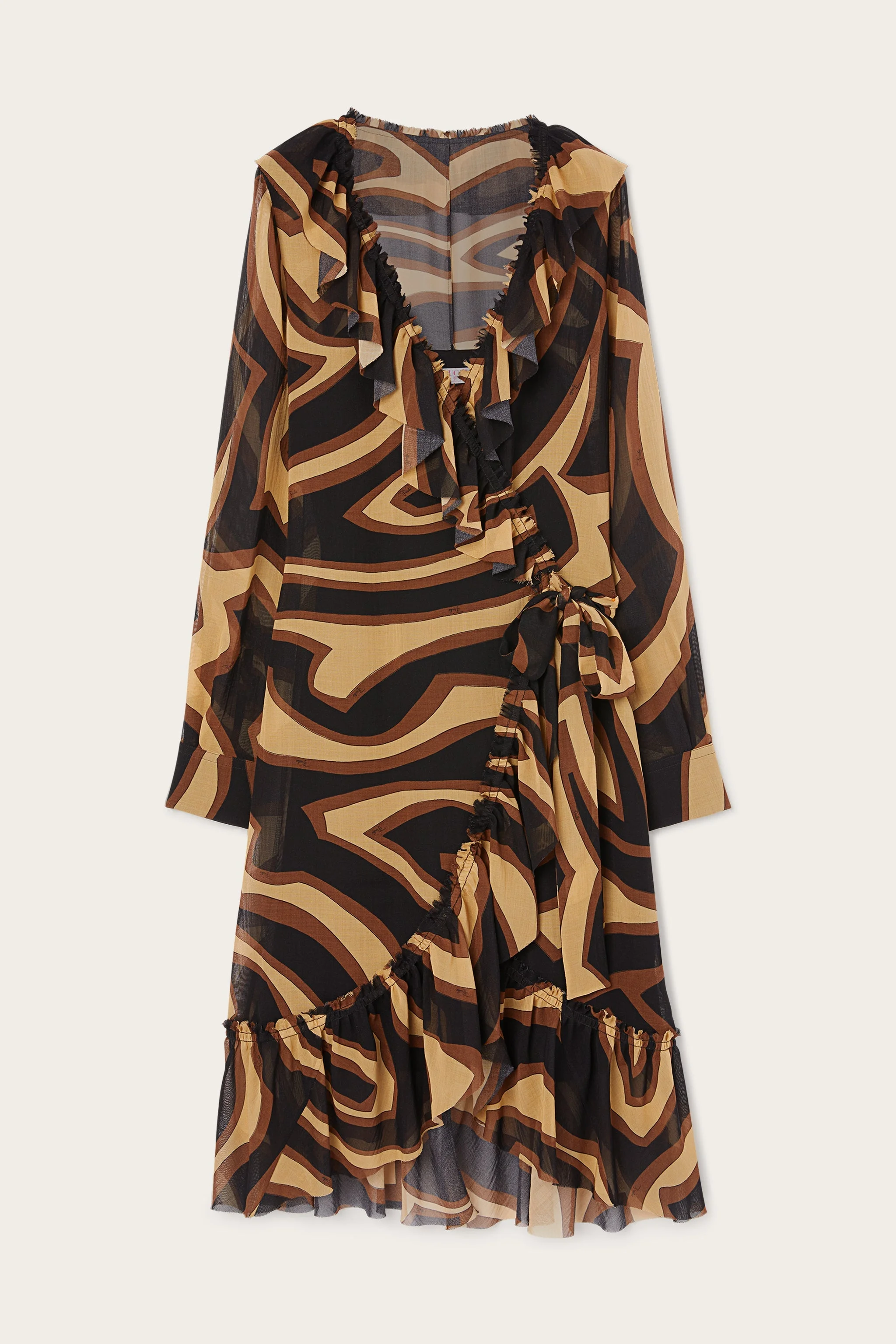 Feminine and sensual, this wrap dress interprets Pucci elegance with a distinctive graphic touch. The midi silhouette, with long sleeves and a plunging neckline, is enhanced by delicate ruffled details and ties at the waist that emphasize the body's silhouette with sophisticated draping. The light and airy silk fabric features the Labirinto print in black and gold: an archival motif that exudes hypnotic vibes, striking the perfect balance between order and wonder. - Black and Gold - Main fabric: 100% silk – Lining: 100% silk - Fitted silhouette with draping - Deep neckline - Long sleeves - Laces at the waist - Delicate dry clean - Made in Italy - ID: 5URG025U790049