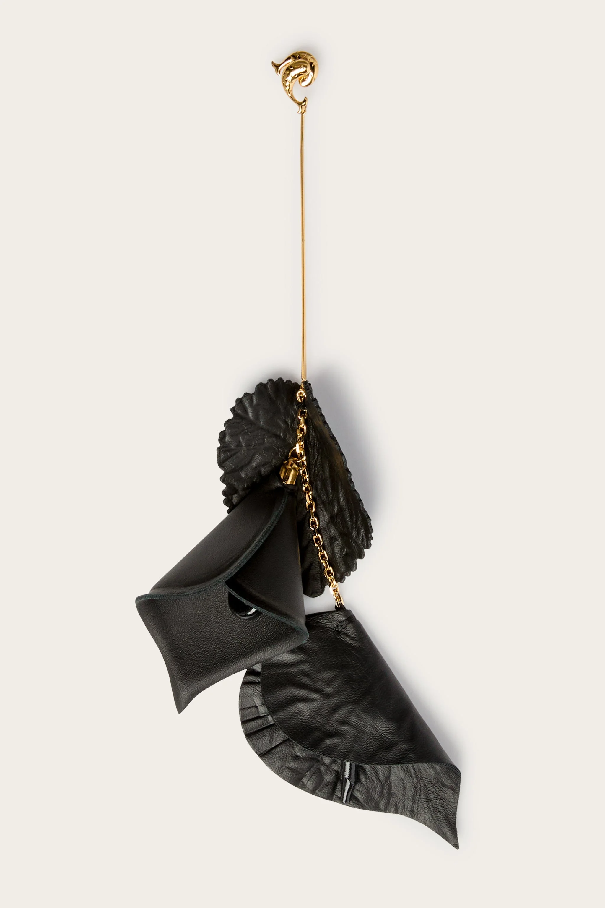 A dramatic piece of jewelry that encapsulates all of Pucci's creativity. This single pendant earring combines iconic and textural elements: the Pucci fish as a button, a central metal stick, and thin chains ending in three leather flowers with a light and playful movement. The shiny gold finish adds brightness and makes this piece perfect for completing an elegant look with an artistic and unexpected touch. - Gold and Black - Material: Brass - Polished gold finish - Mono earring pendant - Pucci fish like button - Chains with 3 leather flowers - Stiff metal center element - Not washable - Made in Italy - ID: 5UAL305U920N04