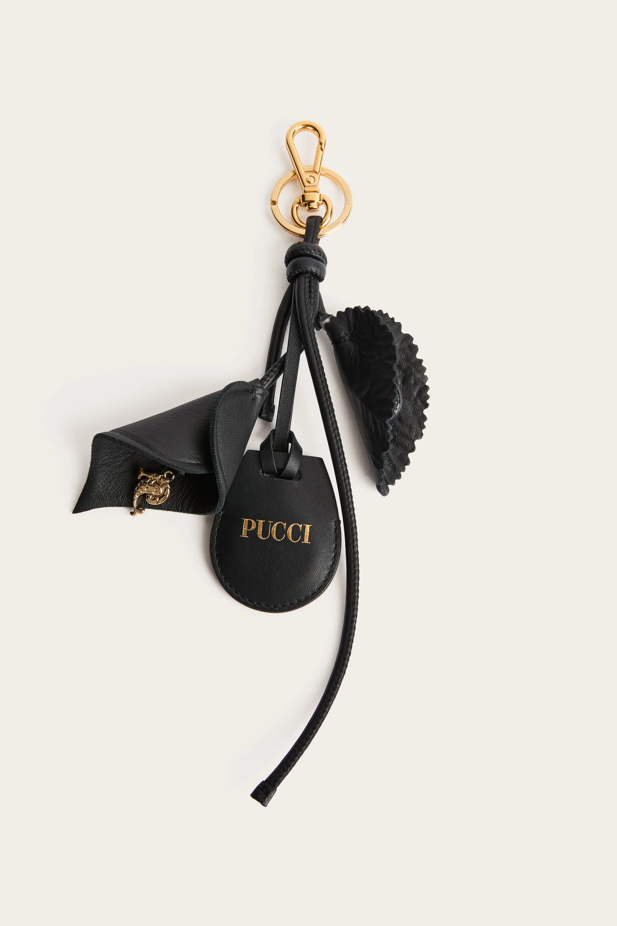 A practical and distinctive accessory, this leather tag holder is designed to accompany every journey or bag with an unmistakable Pucci touch. The design is enriched with floral leather elements, which add a refined decorative accent. The hook and split ring make it easy to attach anywhere, combining functionality and style. - Black - Exterior: 100% leather – Interior: 100% leather - Metal hook with split ring - Compact and functional design - Do not wash - Made in Italy - ID: 5USJ315U011999