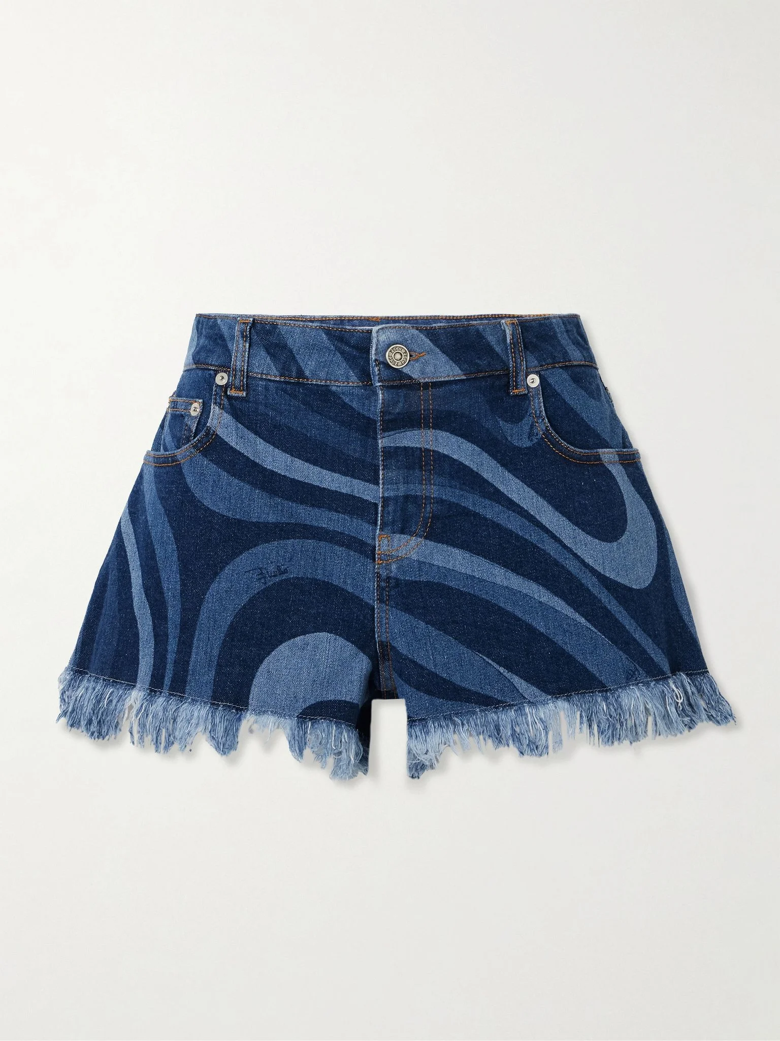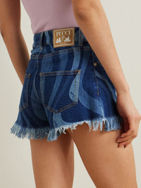 PUCCI's shorts are cut from denim and emblazoned with the house's archival 'Marmo' print, which was designed by Emilio Pucci in the '70s. They're designed to sit high on the waist and are frayed at the hems for a lived-in, vintage feel. Size & Fit - Fits true to size, take your normal size - High-rise, cut for a slim fit - Particularly short in length - Mid-weight, non-stretchy denim - Model is 177cm/ 5'10" and is wearing an IT 40 Model measurements: - Bust: 81cm/ 32" - Waist: 68cm/ 27" - Hip: 94cm/ 37" Details & Care - Tonal-blue denim - Button and concealed zip fastening at front - 99% cotton, 1% elastane - Hand wash or dry clean
