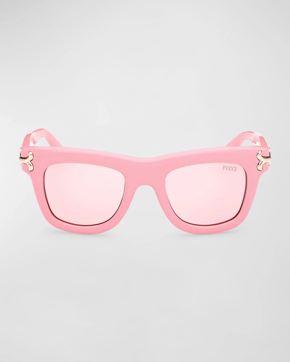 - Emilio Pucci "EP0222W" square sunglasses in acetate - Lens/bridge/temple (in mm): 50-22-140 - Solid lenses; logo on the corner - Saddle nose bridge - Logo on temples - Thin, tapered arms - 100% UVA/UVB protection - Made in Italy - Proposition 65 warning for California residents