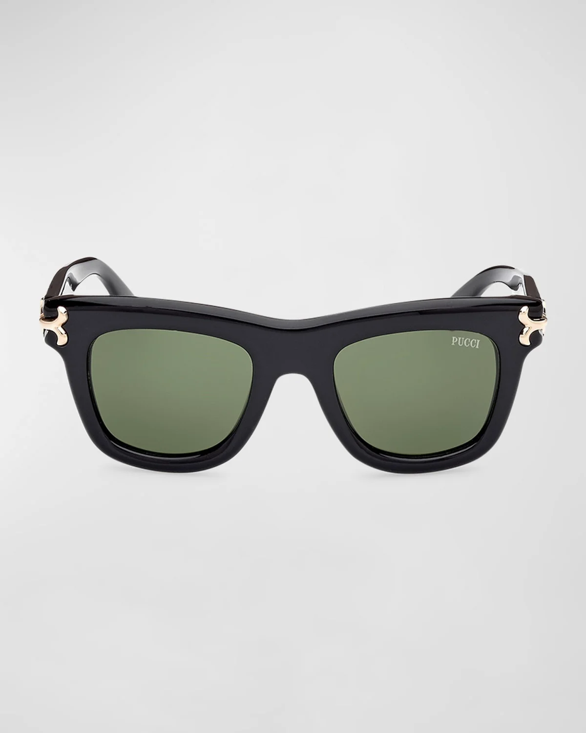 - Emilio Pucci "EP0222W" square sunglasses in acetate - Lens/bridge/temple (in mm): 50-22-140 - Solid lenses; logo on the corner - Saddle nose bridge - Logo on temples - Thin, tapered arms - 100% UVA/UVB protection - Made in Italy - Proposition 65 warning for California residents