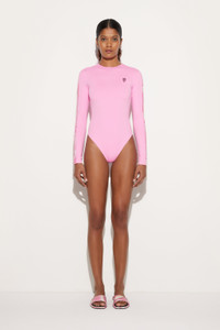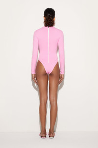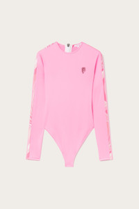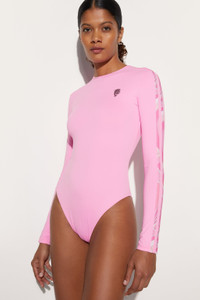 A refined and sporty design that combines style and functionality. This high-neck, long-sleeved one-piece swimsuit is designed for those who love a sophisticated look without sacrificing comfort. Its fitted silhouette sculpts the figure, while printed stripes on each arm add a distinctive graphic touch. Made of stretch Lycra with anti-UV treatment, it offers a snug fit and protection from the sun's rays. The Pink Panther color lends brightness and energy to the garment, enhancing its clean, modern lines. - Pink Panther - Main fabric: 82% Polyamide, 18% Elastane - Secondary fabric: 80% Polyamide, 20% Elastane - High collar - Long sleeves - Stripes printed on each arm - Fitted fit - Hand wash. - Made in Italy. - ID: 5HMC405H645H46 - Model is 175 cm tall and wears Italian size 38.
