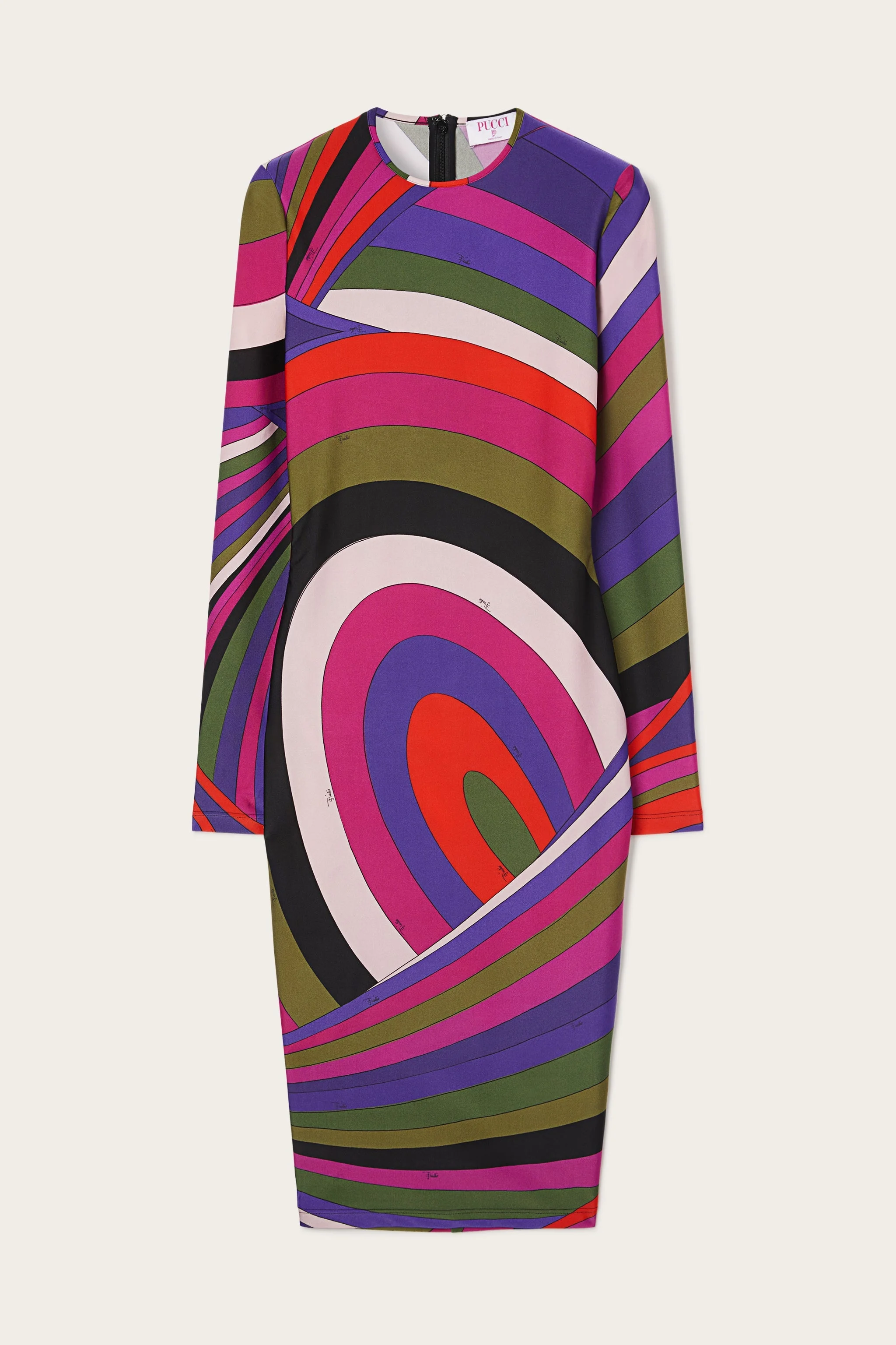 A simple yet striking piece, perfect for enhancing the silhouette with a graphic twist. This long-sleeved dress is made from stretch Lycra with UV protection, offering a snug and comfortable fit. The round neckline adds a clean balance to the lines of the design, while the multicolored Iride print adds an unmistakable Pucci archive touch. - Multicolor - Stretch Lycra with UV protection - Main fabric: 80% polyamide – 20% elastane - Round neckline - Long sleeves - Fitted fit - Wash at max 30°C - Made in Italy - ID: 5UJG665U755011
