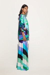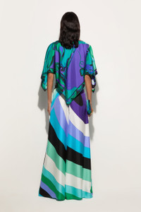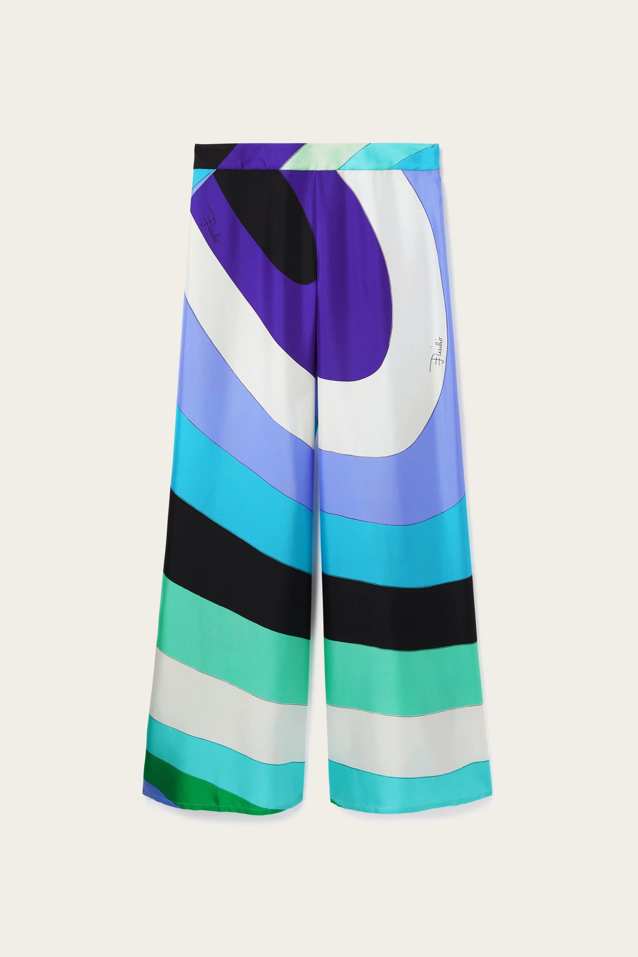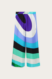 These wide-leg pants are designed to offer a comfortable and easy fit, ideal for accompanying you throughout the day.The Iride print in green and lilac adds a touch of delicate movement, while the slightly stiff finish enhances the natural texture of silk, enhancing the uncompromising design. - To offer you a unique Pucci garment, we use an all-over print that makes the product unrepeatable. Therefore, the pattern print may vary from the one displayed in the photo. - Green and lilac - 100% silk - Wide leg and comfortable fit - Iride print - Gently dry clean. - Made in Italy - ID: 5HRT035H851050 - The model is 176 cm tall and wears a 38 italian size.