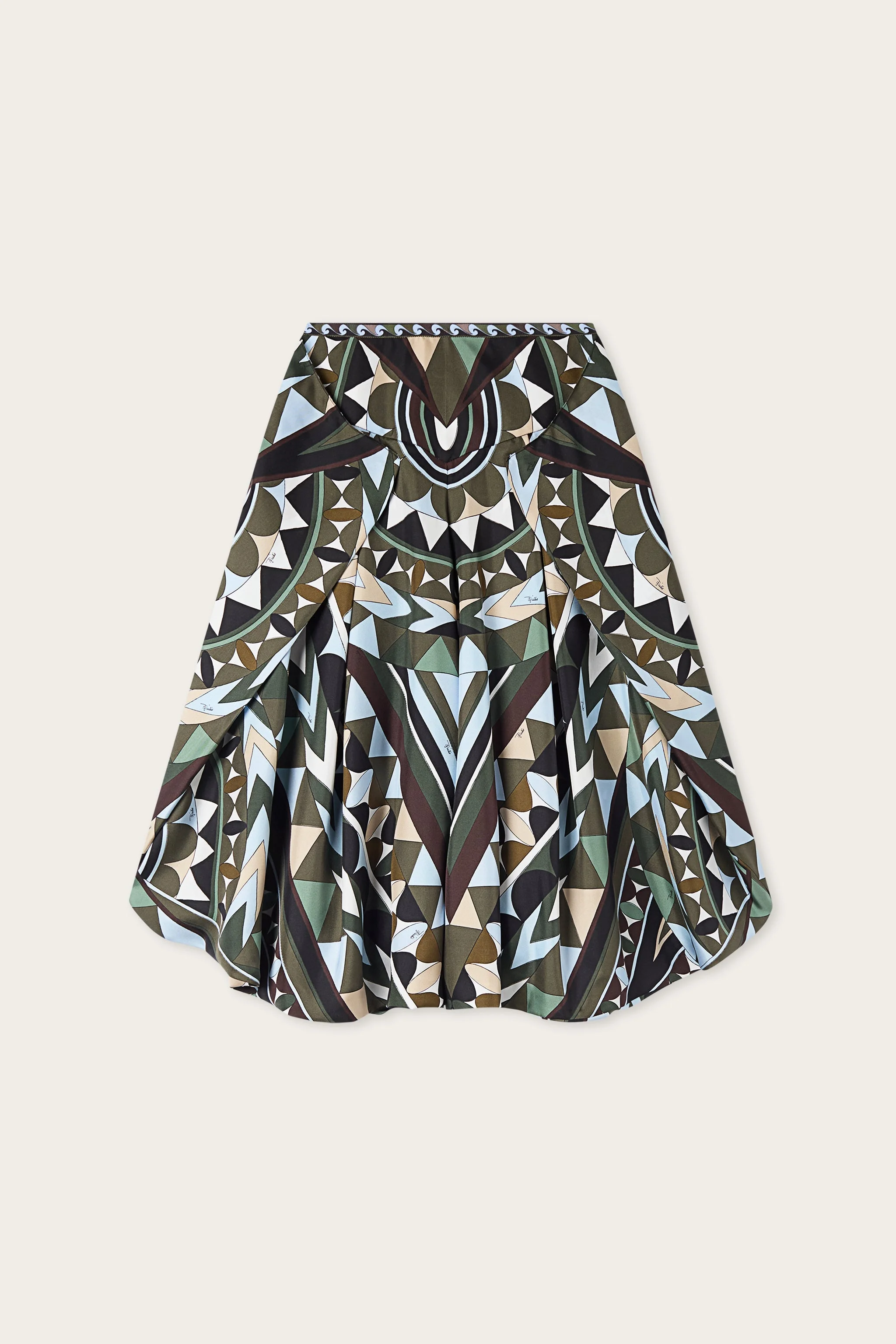 A fluid, contemporary style that reinterprets the sarong with a sophisticated attitude. Crafted in silk twill, these wraparound pants follow the body's movements naturally, creating a dynamic, lightweight silhouette. The side panels feature patch pockets, a functional detail that complements the fluidity of the design. The Manuba print in shades of khaki and blue crosses the surface with a bold graphic rhythm, enhancing the contrast between construction and movement. - To offer you a unique Pucci garment, we use an all-over print that makes the product unrepeatable. Therefore, the pattern print may vary from the one displayed in the photo. - Khaki and Blue - 100% silk - Sarong style - Side panels with patch pockets - Dry clean only - Made in Italy - ID: 6HRT066H771040