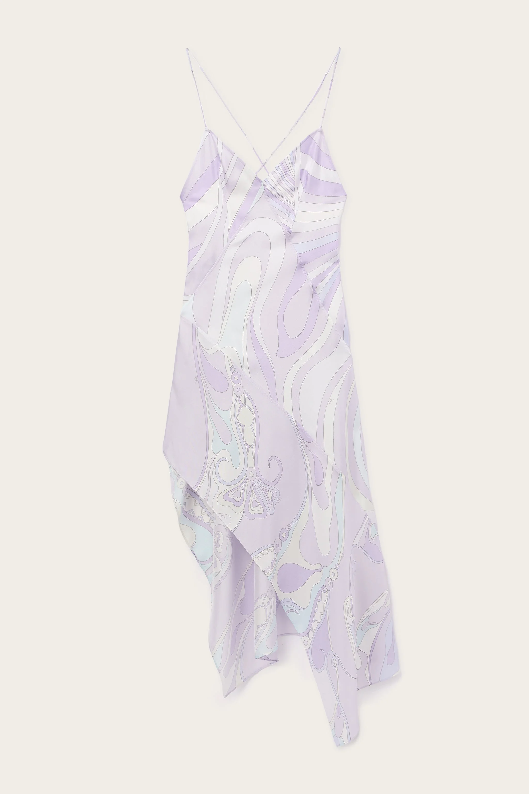 A flowing, refined garment that boldly celebrates femininity. This dress with thin straps features a plunging neckline and an asymmetrical hem that adds movement and dynamism to the silhouette. The seams along the body elegantly enhance the figure. Crafted in silk twill, it boasts a slightly stiff finish that enhances the fabric's shine and natural texture. The Iride print, with its concentric arches and lavender tone, expresses the vibrant energy typical of the Pucci universe. - To offer you a unique Pucci garment, we use an all-over print that makes the product unrepeatable. Therefore, the pattern print may vary from the one displayed in the photo. - Lavender - Silk twill - Thin straps - Deep neckline - Asymmetrical hem - Dry clean only - Made in Italy - ID: 5URI065U751009