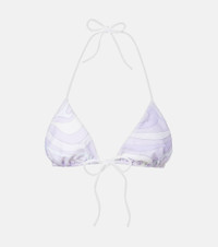 This bikini top from Pucci is cut in a classic triangle silhouette with a front drawstring self-tie closure. Featuring the brand’s Marmo print in pastel purple, the style offers adjustable comfort with signature flair. Product Details - Material: 80% polyamide, 20% elastane - Care instructions: hand wash - Made in Italy - Designer color name: Lavander - Item color: white, purple - Lining: 84% polyester, 16% elastane - Closure: self-ties - Each piece is unique and prints may differ slightly from those shown - Includes: dust bag - Item number: P01110692 Size & Fit - True to size - Unpadded Top - The model seen in the picture is 178cm-5'10", cup size B, and wearing a size XS