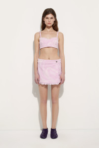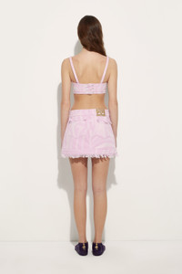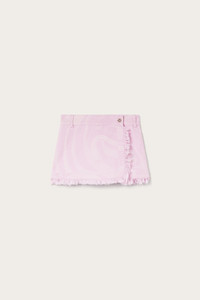 Sixties spirit and contemporary construction come together in this pink denim wrap mini skirt, reinterpreted with a graphic designer twist. The Marmo-effect laser work crosses the fabric in sinuous waves, creating an iconic and unexpected design. The slightly stretch denim ensures a comfortable fit, while the wrap-around shape flatters the silhouette with ease. - To offer you a unique Pucci garment, we use an all-over print that makes the product unrepeatable. Therefore, the pattern print may vary from the one displayed in the photo. - Pink laser - Kane piece-dyed denim with laser Marmo print - 98% cotton, 2% elastane - Wrap style - Mini length - Side closure - Slightly stretch fabric for added comfort - Delicate wash at max 30°C - Made in Italy - ID: 5UDV165U997A03