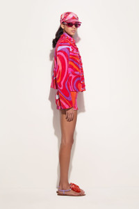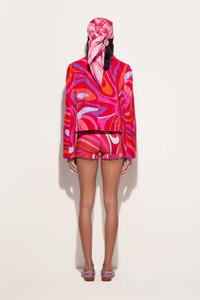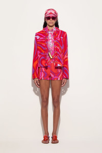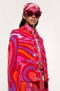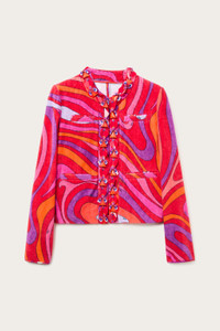 A garment that combines craftsmanship and creativity, perfect for those seeking a sophisticated yet personality-rich look. This jacket features padded twill details around the cuffs and chest, enhanced by a round collar and elegant buttons that give a touch of class.Edges decorated with orange plastic triangles and folded sequins of different sizes and colors add a playful and light effect. Handmade embroidery echoes the unique spirit of the Pucci Pesci logo, celebrating the house's distinctive style. Marmo print in coral/fuchsia completes the design with a burst of energy and vibrancy. - To offer you a unique Pucci garment, we use an all-over print that makes the product unrepeatable. Therefore, the pattern print may vary from the one displayed in the photo. - Coral and Fuchsia - Main fabric: 100% cotton - Padded twill details on cuffs and chest - Round collar and elegant buttons - Crafted embroidery with orange plastic triangles and multicolored sequins - Marmo print - Gently dry clean. - Made in Italy - ID: 5HRB855H889047 - Model is 176 cm tall and wears a 38 italian size.