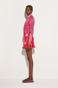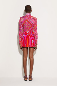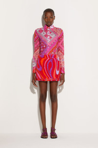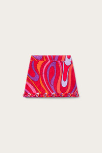A blend of craftsmanship and contemporary design characterizes this straight-cut mini skirt embellished with unique decorative details. The hand-embroidered hem features plastic triangles and sequins of different sizes and colors that create a dynamic and luminous effect.Light and playful embroidery echoes the iconic Pucci fish logo, celebrating the brand's distinctive spirit. The Marmo print in coral and fuchsia enhances the graphic appeal of the garment, while the 100% cotton fabric with silk trim ensures a comfortable and sophisticated fit. - To offer you a unique Pucci garment, we use an all-over print that makes the product unrepeatable. Therefore, the pattern print may vary from the one displayed in the photo. - Coral and fuchsia - 100% Cotton - Finish: 100% Silk - Straight cut - Hand-embroidered hem with plastic triangles and folded sequins - Pucci fish logo-inspired detailing - Comfortable, structured fit - Gently dry clean. - Made in Italy. - ID: 5HRV455H889047 - The model is 178 cm tall and wears Italian size 38.