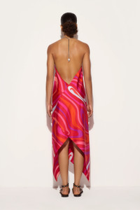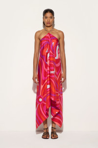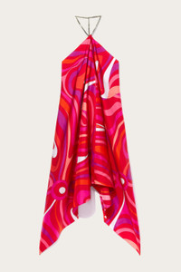 A modern interpretation of Pucci heritage comes to life in this silk twill dress, where the Marmo print in coral and fuchsia is transformed into a chromatic symphony with a strong visual impact. Its softly draped silhouette, suspended on a refined gold chain with Pesci logo, caresses the figure lightly, while the uncovered back adds a touch of sensuality.The American neckline elegantly frames the shoulders, while the handkerchief hemline recalls the iconic Pucci scarf world, enhancing the movement of the fabric. - To offer you a unique Pucci garment, we use an all-over print that makes the product unrepeatable. Therefore, the pattern print may vary from the one displayed in the photo. - Coral and fuchsia - 100% Silk - American neckline - Sleeved design - Uncovered back - Adjustable snap hook closure at nape of neck and Pesci logo pendant - Gently dry clean. - Made in Italy. - ID: 5HRH205H761006