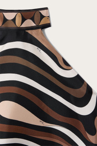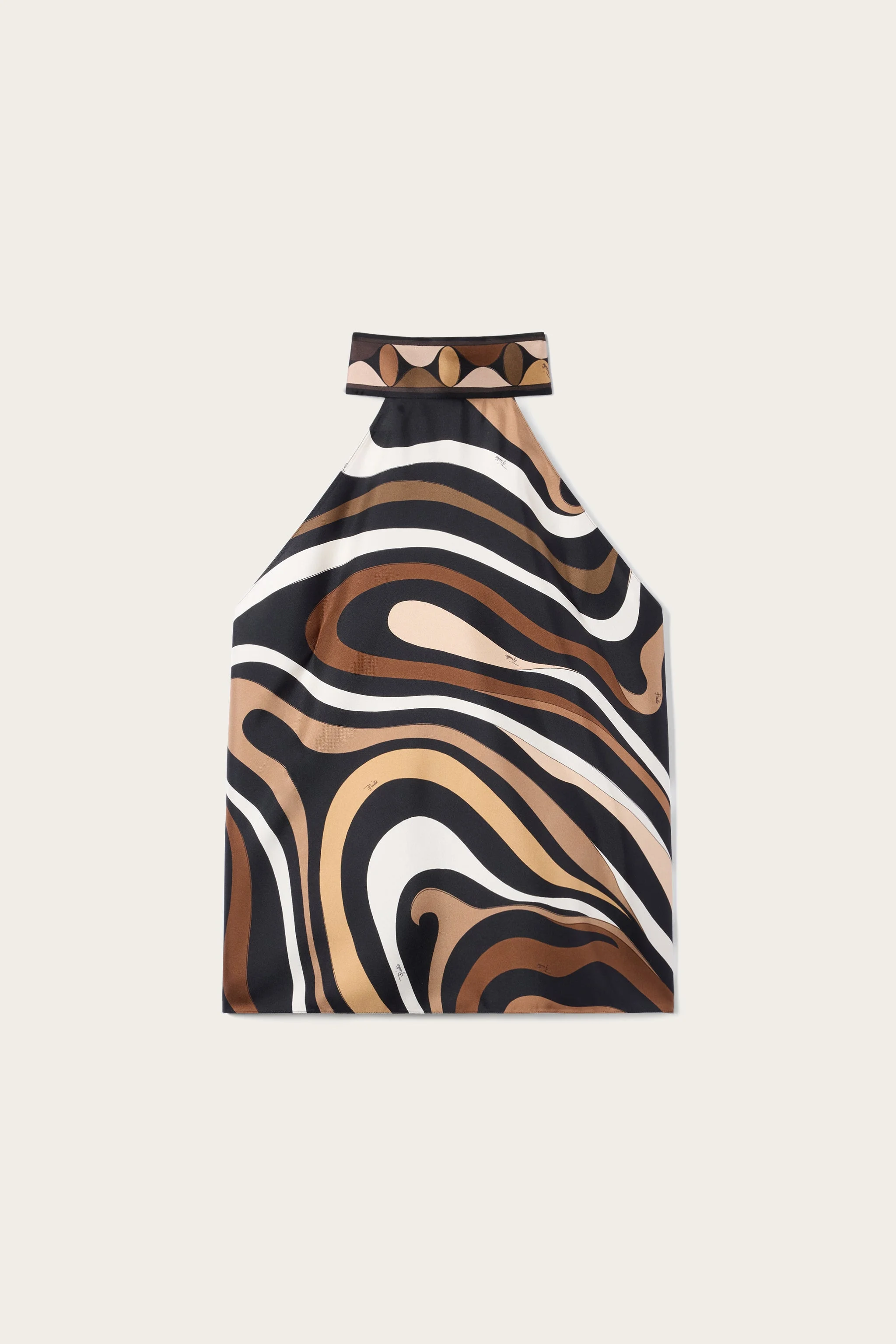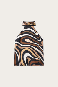 A simple, sophisticated top that plays with light volumes and refined details. Made from pure silk, this sleeveless style features a halter neckline and a tie at the back of the neck, adding a feminine and versatile touch. The black and gold Marmo print—an iconic archive design dating back to 1968—is inspired by the reflections of light in Capri's Blue Grotto, translating the waves of the sea into psychedelic, kaleidoscopic lines for a dynamic, modern effect. - To offer you a unique Pucci garment, we use an all-over print that makes the product unrepeatable. Therefore, the pattern print may vary from the one displayed in the photo. - Black and Gold - 100% silk - Sleeveless - Halter neck with adjustable tie - Flowing fit - Dry clean only - Made in Italy - ID: 5URM415U761004