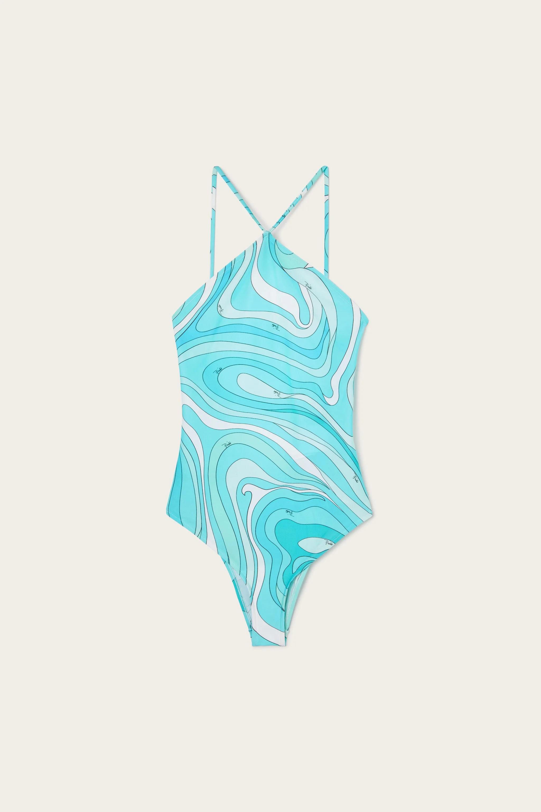 A sensual, sculptural design characterizes this one-piece swimsuit, defined by a deep V-neckline that elongates the figure. Made from stretch Lycra with UV protection, it is decorated with a Marmo print in a vibrant turquoise color, reminiscent of the waves and reflective light of the Mediterranean. Perfect for those who love graphic, sophisticated elegance, even at the beach. - To offer you a unique Pucci garment, we use an all-over print that makes the product unrepeatable. Therefore, the pattern print may vary from the one displayed in the photo. - Turquoise - Stretch Lycra - Deep V-neck - Fitted style - Hand wash - Made in Italy - ID: 5UMC305U775067
