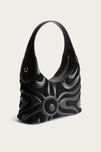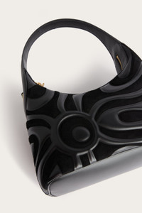 Decisive elegance with a graphic soul: this leather hobo bag perfectly embodies Pucci's mix of heritage and modernity. The suede base is embellished with an embossed Marmo design in nappa leather, which adds tactile depth and an unexpected sculptural effect. The handle allows for comfortable shoulder carry, while the fish-shaped zip pull adds an iconic detail. Inside, the Alcantara lining houses a flat pocket for essentials. - Black - Suede base - Embossed Marmo pattern on the exterior - Alcantara lining - Zip closure - Fish-shaped pull tab - Flat interior pocket - Handle: 22 cm - Do not wash - Made in Italy - ID: 5UBC255U008999